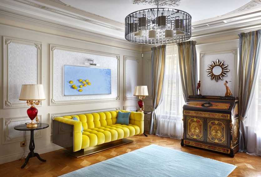 Диван насыщенного лимонного цвета освежает нейтральный в колористическом плане классический интерьер. Еще одно активное цветовое пятно — картина современного художника. На их фоне эффектно контрастируют классический комод в технике «буль» и деликатная гипсовая лепнина.