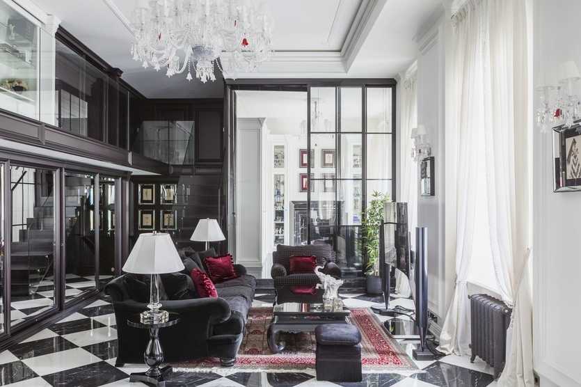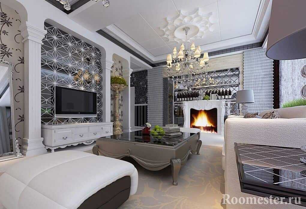 Контрастная черно-белая гамма — смелое решение для интерьера гостиной в классическом стиле.