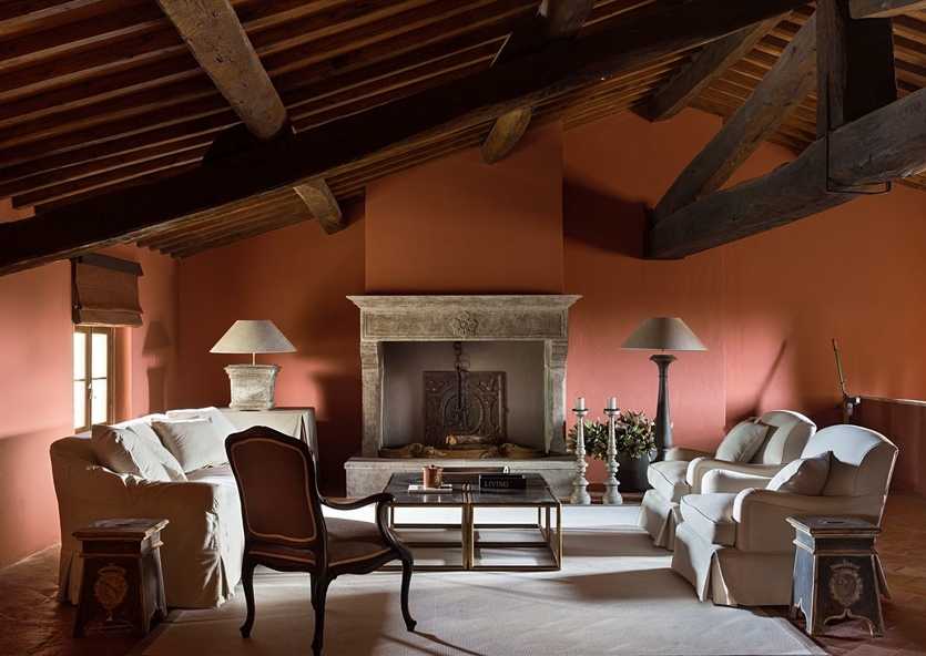 Хотите, чтобы ваша гостиная выглядела как старинная итальянская вилла, покрасьте стены в терракотовый цвет.