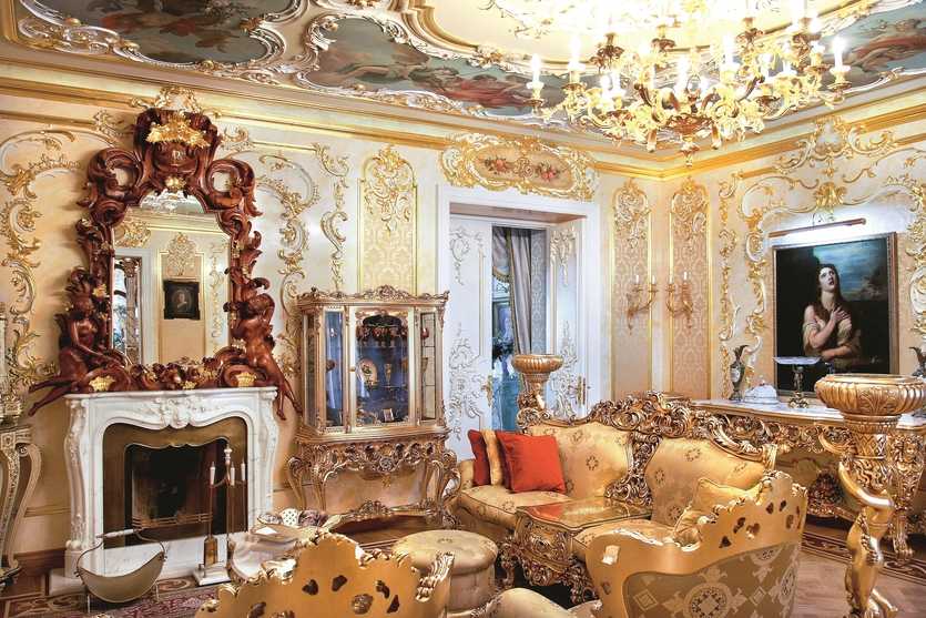 А эта светлая гостиная в стиле барокко просто светиться, сверкает. Интерьер «сделал» золотой цвет.
