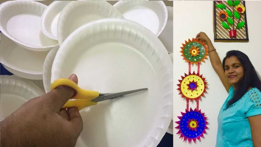 Крепление для тарелок продумано. Следующий этап — изготовление бумажных макетов. Эта процедура нужна для исключения ошибок, после которых остаются следы на стене при размещении композиции или одиночного экземпляра. Для определения диаметра бумагу прикладывают к декоративным тарелкам, по краю ободка обводят карандашом, вырезают круги. Плоские фигуры закрепляют монтажной лентой на стене в задуманном порядке. Если композиция устраивает, можно вешать тарелки.