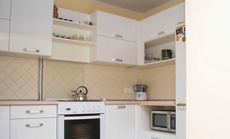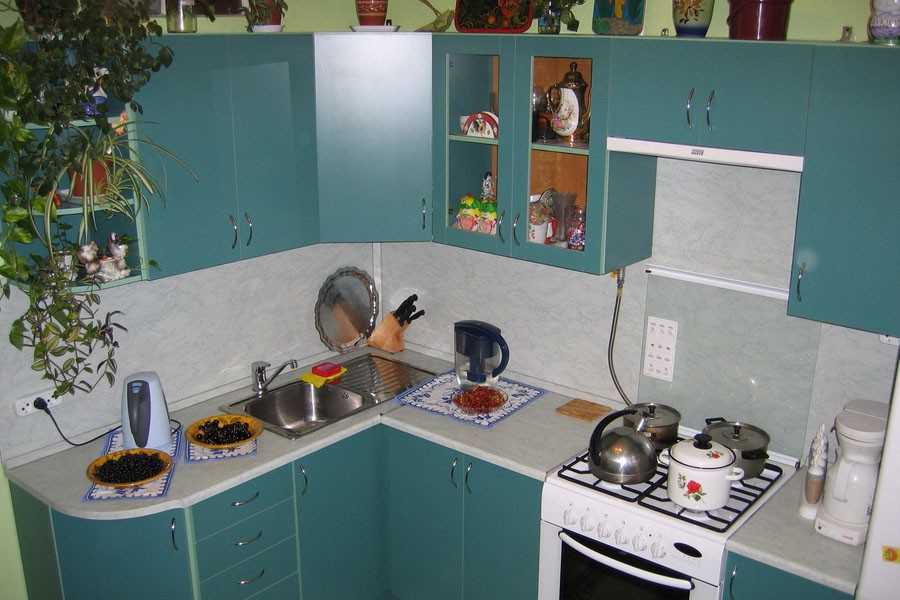 Лучше подбирать угловой гарнитур. Угол кухни в хрущевке будет максимально задействован, а угловые шкафы считаются более вместительными, чем классические. Отличным выбором станут шкафчики с дверками-купе. Это поможет и зрительно увеличить кухню в хрущевке.
