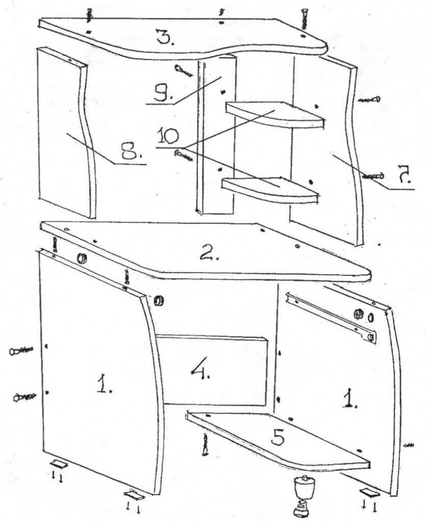 При изготовлении чертежа сначала определяются размеры основной столешницы, где будет располагаться монитор. Затем определяются размеры дополнительной рабочей поверхности. После этого создаются боковины и нижняя подпорка в углу.