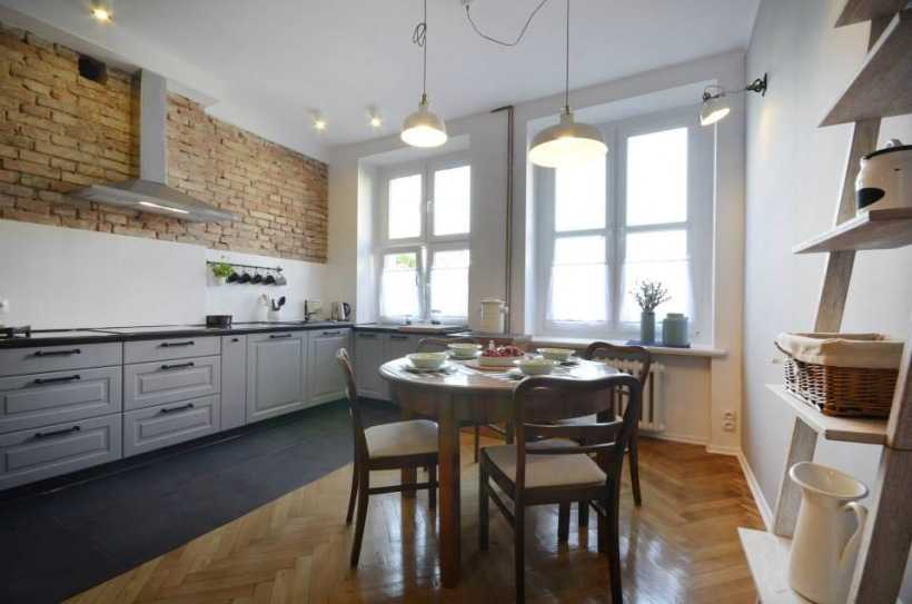Большие, но длинные, то есть узкие, кухни тоже не так-то просто обставить, чтобы сделать их по-настоящему комфортными. Идеальным решением может стать двухрядное размещение предметов мебели. Под одну стену обычно ставят технику, вписывая ее в пространство между мойкой и плитой, а под другую – отправляют холодильник и мебельный гарнитур. Решение расставить мебель на кухне двухрядно будет оправдано только в том случае, если между этими самыми рядами останется проход не менее метра с четвертью в ширину. Для чего это нужно? Для обустройства обеденной зоны. В нем вполне может появиться барная стойка или складной столик с табуретками.