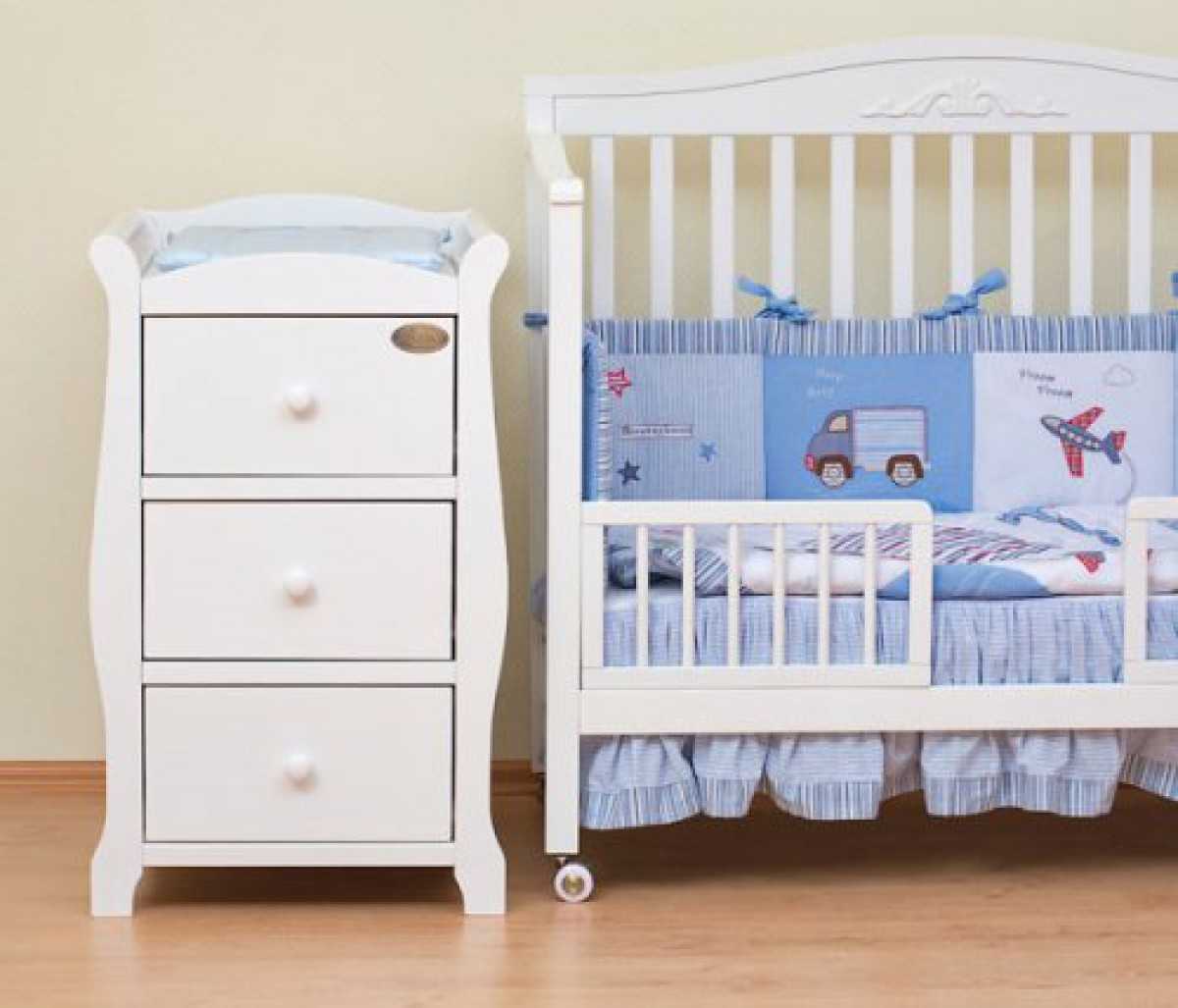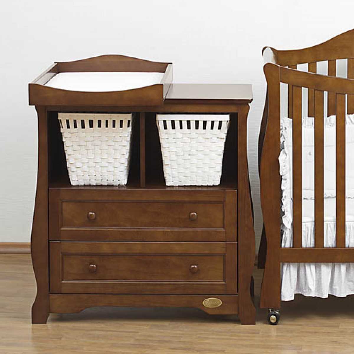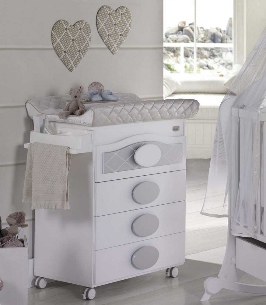 Кроме таких предметов имеются другие специфические разновидности. Отдельно следует выделить специальную кроватку с комодом и пеленальным столиком, причем данный комплект выполняется в едином стиле, что позволяет сделать замечательную и красивую детскую комнату. Перед тем, как выбрать пеленальный комод, следует определиться с тем, в какой части помещения он будет располагаться, чтобы заранее знать оптимальные его размеры.