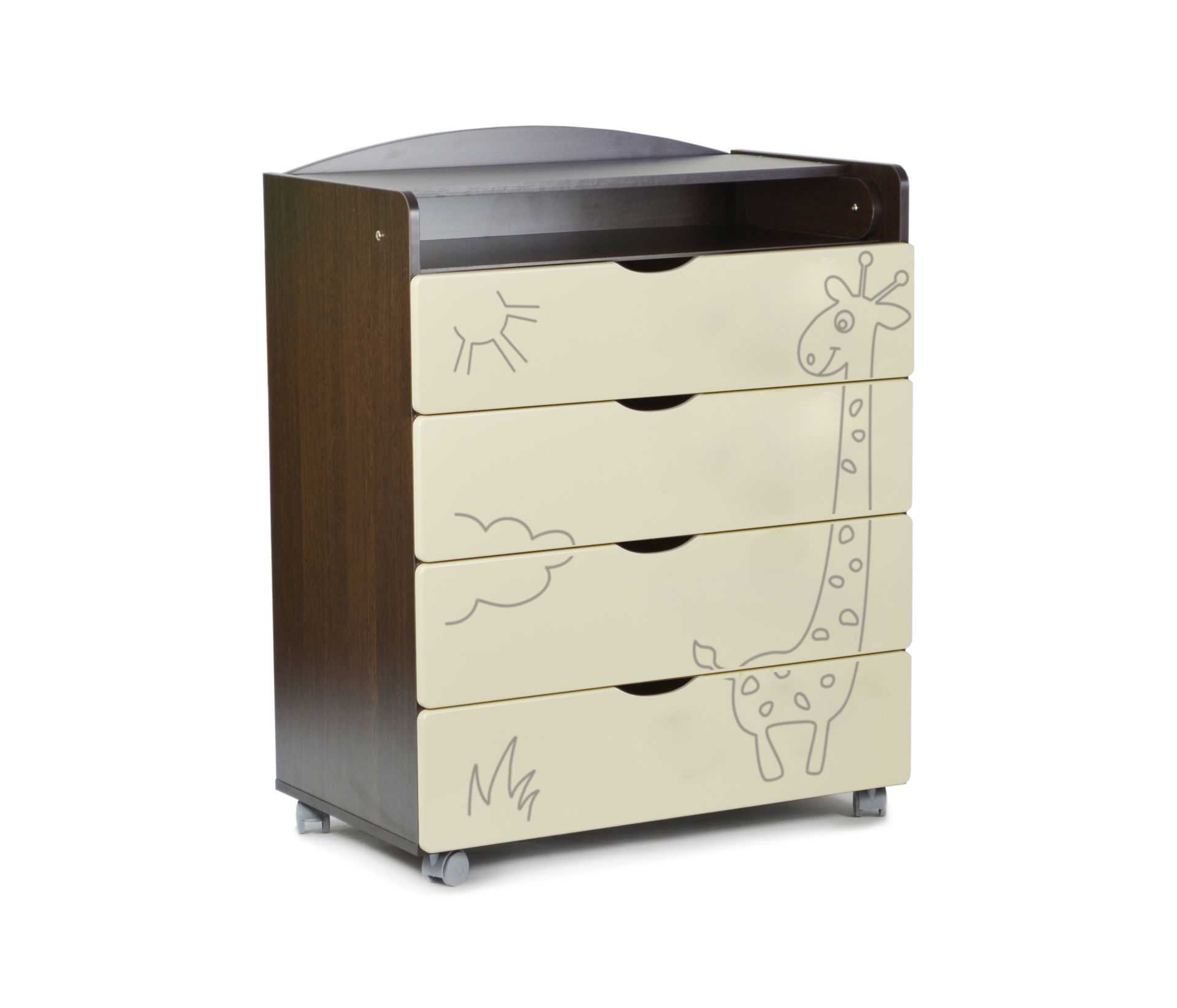 - Комод с пеленальным столиком Иришка Gandilyan. Материал – бук, ДСП. Размеры 84 х 44 см, высота 96 см. Чтобы удобнее было передвигать комод, на задних ножках у него закреплены колесики. Для хранения вещей имеется 4 глубоких ящика. Цена 10760 руб.
