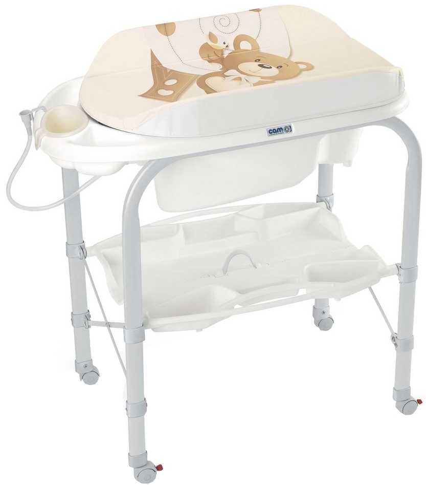 - Столик для пеленания CAMNuvola. Функциональная модель для ванной или детской комнаты. В комплект входит откидная пластиковая доска, ванночка с карманом для банных принадлежностей, два пластиковых лотка. Имеются колеса, на задней паре есть тормоза. Габариты 97 х 61 см, высота 104 см, вес 9,7 кг. Модель предназначена для малышей от рождения до 12 месяцев. Цена 4500 руб.