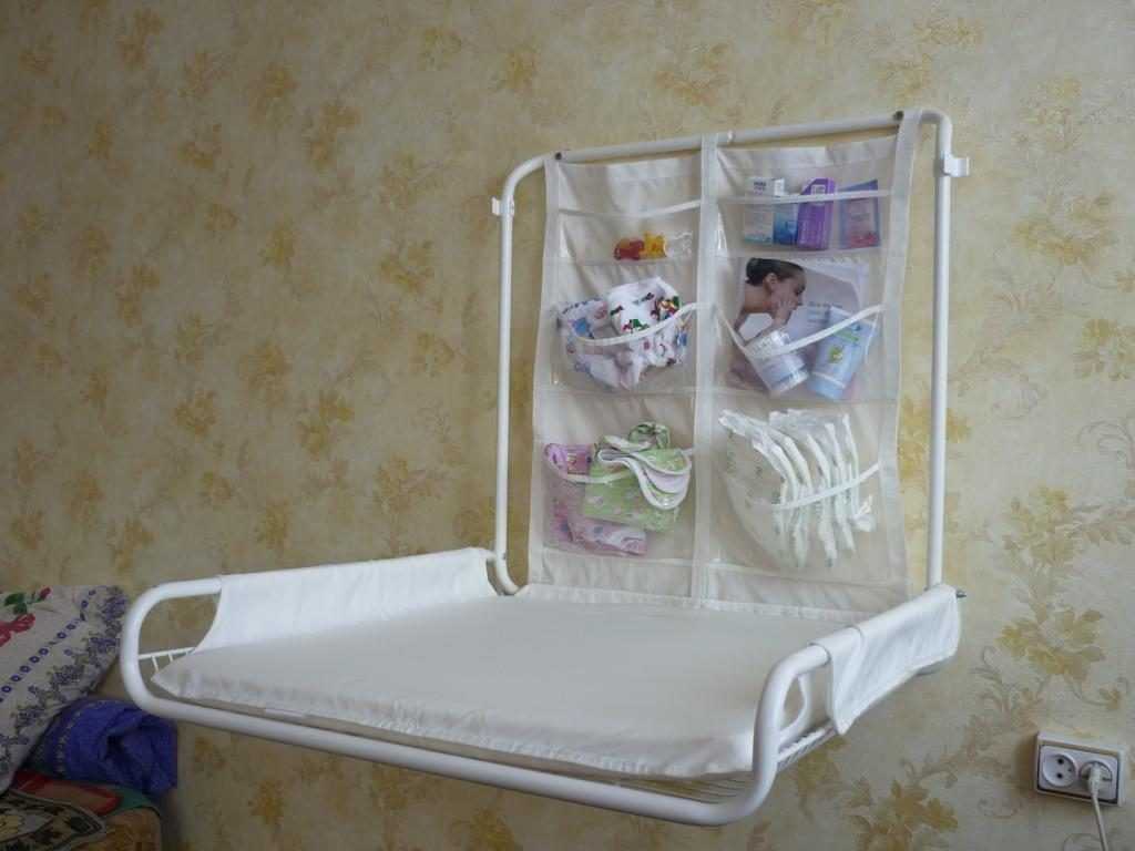 Складной столик. По устройству он похож на гладильную доску: состоит из металлического каркаса с ножками, которые раздвигаются и фиксируются на заданной высоте, а сверху крепится пластиковая доска с бортиками. Сбоку может быть лоток с карманами для принадлежностей, внизу — 1-2 полки для одежды. Удобным дополнением является ванночка, расположенная под столешницей: после подготовки ребенка к купаниюпеленальную поверхность переводят в вертикальное положение с помощью шарнира.