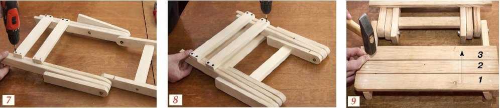 - После полного высыхания деталей прикручивают проножки, закрепляют рейки, монтируют сиденье.