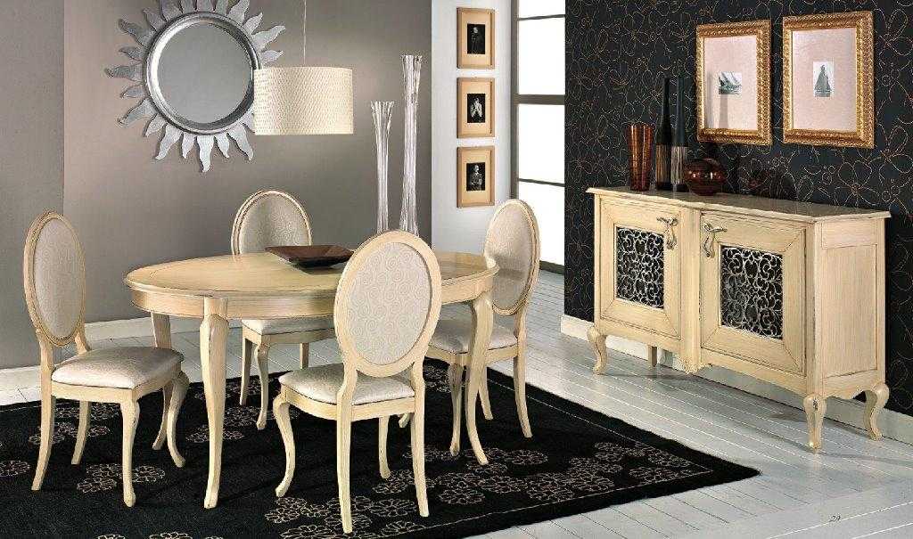 - стулья и Классический стол – это мебельные предметы, сделанные из натурального дерева. Стол весьма массивный и огромный с резными ножками, может быть роспись на столешнице. Стулья также сделаны из дерева, они имеют сиденье и мягкую спинку.
