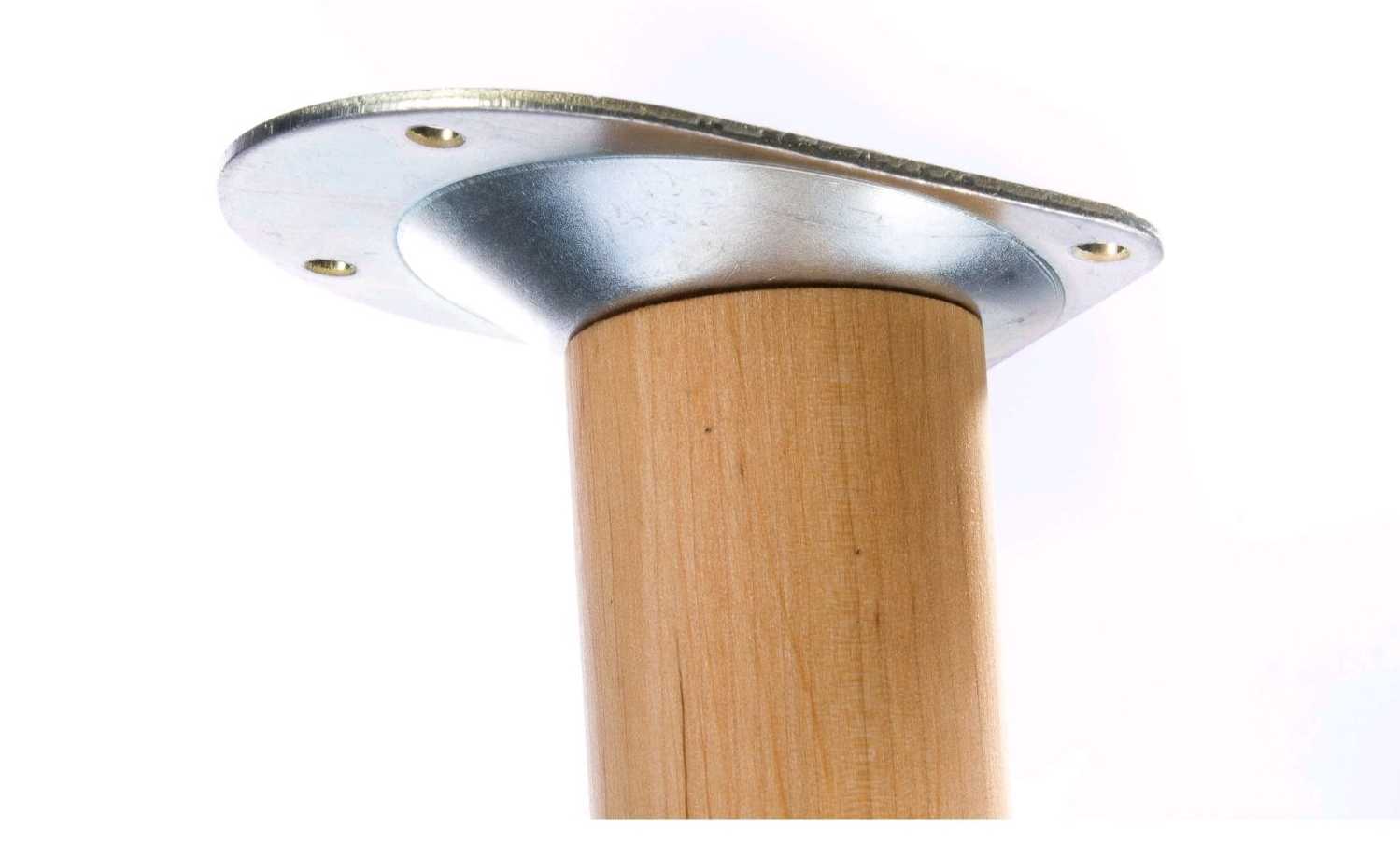 Поверхностные пластины монтируются с каждой из четырех сторон на внутренней стороне столешницы. Чтобы прикрепить ногу к пластине, в комплекте поставляется штифт с резьбой и ответная часть – гайка-втулка. Ее нужно вкрутить в верхнюю часть ножки.