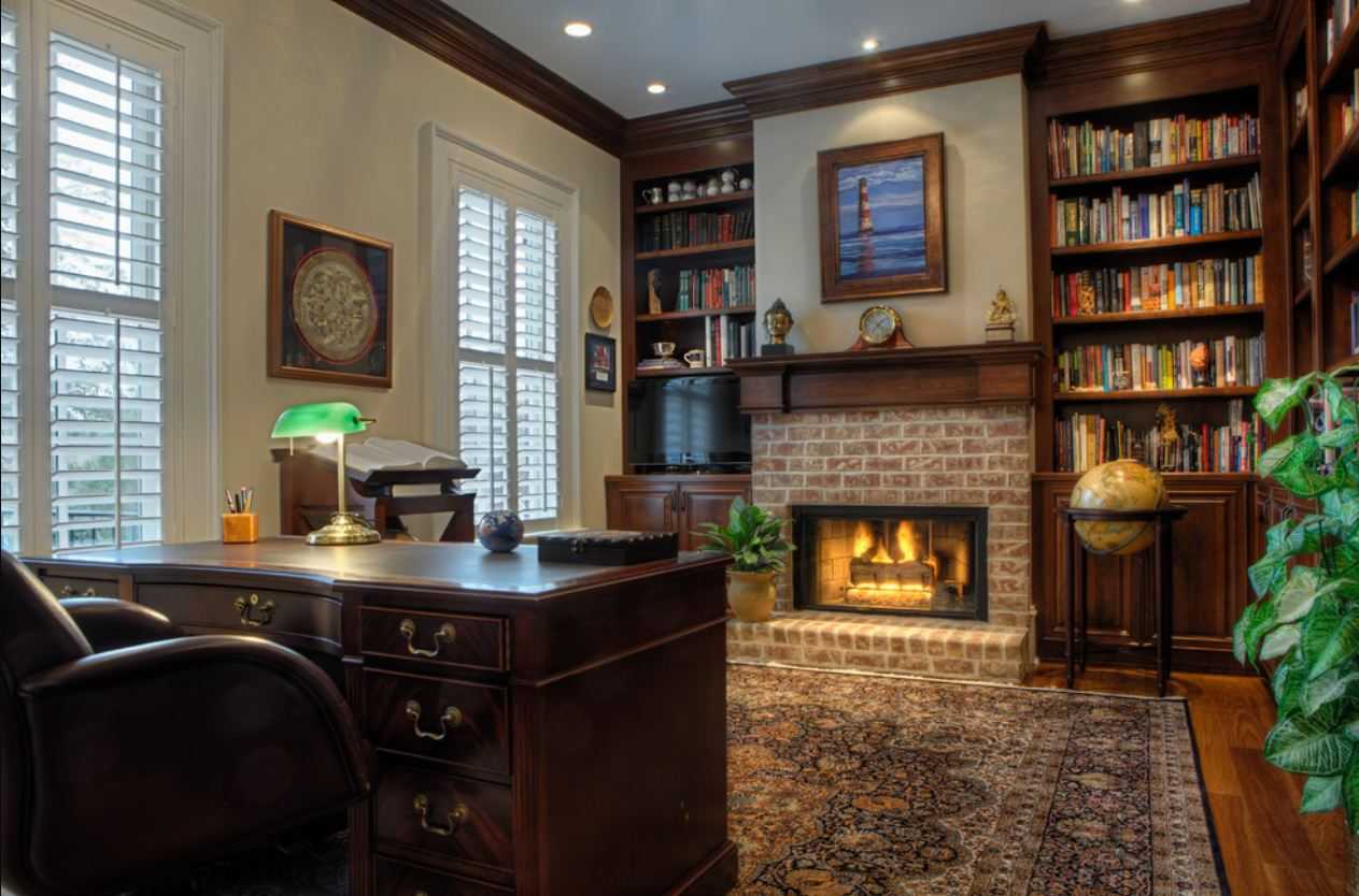 Пространство рабочего кабинета, оборудованное очагом – лучшее место для приема важных гостей, деловых партнеров, а также отличное место для релаксации в одиночку.