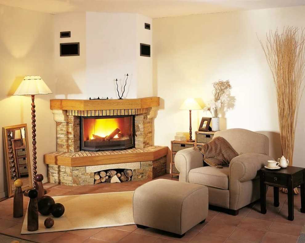 Это один из самых популярных и удобных типов конструкции. Залы с угловыми каминами всегда смотрятся оригинально. Рядом можно удачно обустроить зону отдыха. Например, поставить уютные кресла. Ранее при таком расположении строились наклонные стены дымовой камеры. Современные технологии позволяют применять двухкамерные конструкции. Внешние камеры оформляются в любом дизайнерском решении, а дымоход скрывается внутри стены.