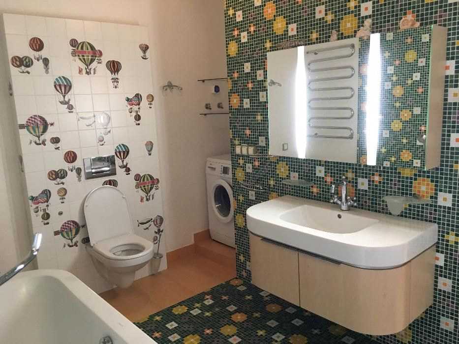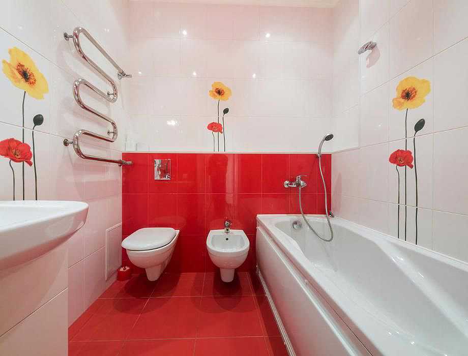 Фон изображения должен перекликаться с оттенком стен. Цвета яркого рисунка должны повторяться во фризах, мебели, сантехнике.