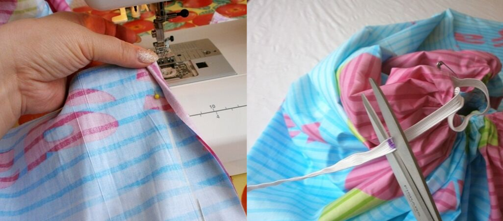 Сделать по периметру полотна небольшую кулиску, подвернув край ткани на 1,5 см внутрь и прострочив на машинке. В конце строчки оставить отверстие около 1 см, в которое будет продеваться резинка