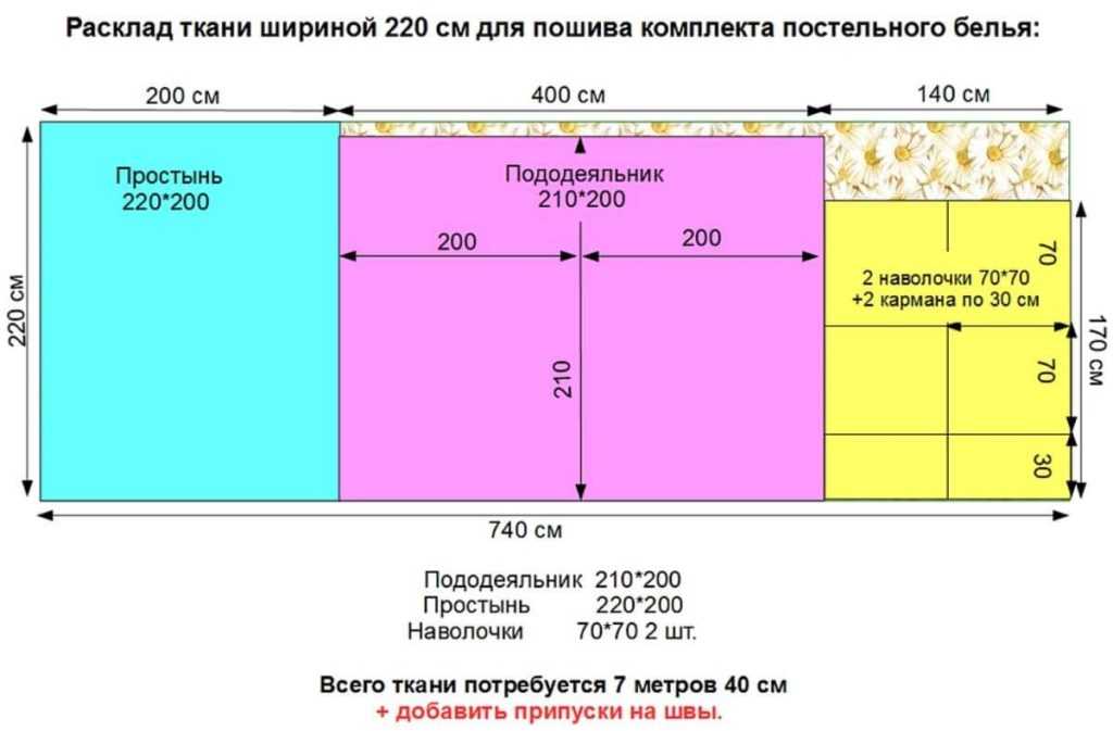 Опытная швея проводит пошив без использования выкройки пододеяльника, наволочки и простыни, но начинающему мастеру она нужна. В интернете можно найти схемы для любых размеров постели. Вы также можете воспользоваться нашими примерами раскроя постельного белья.