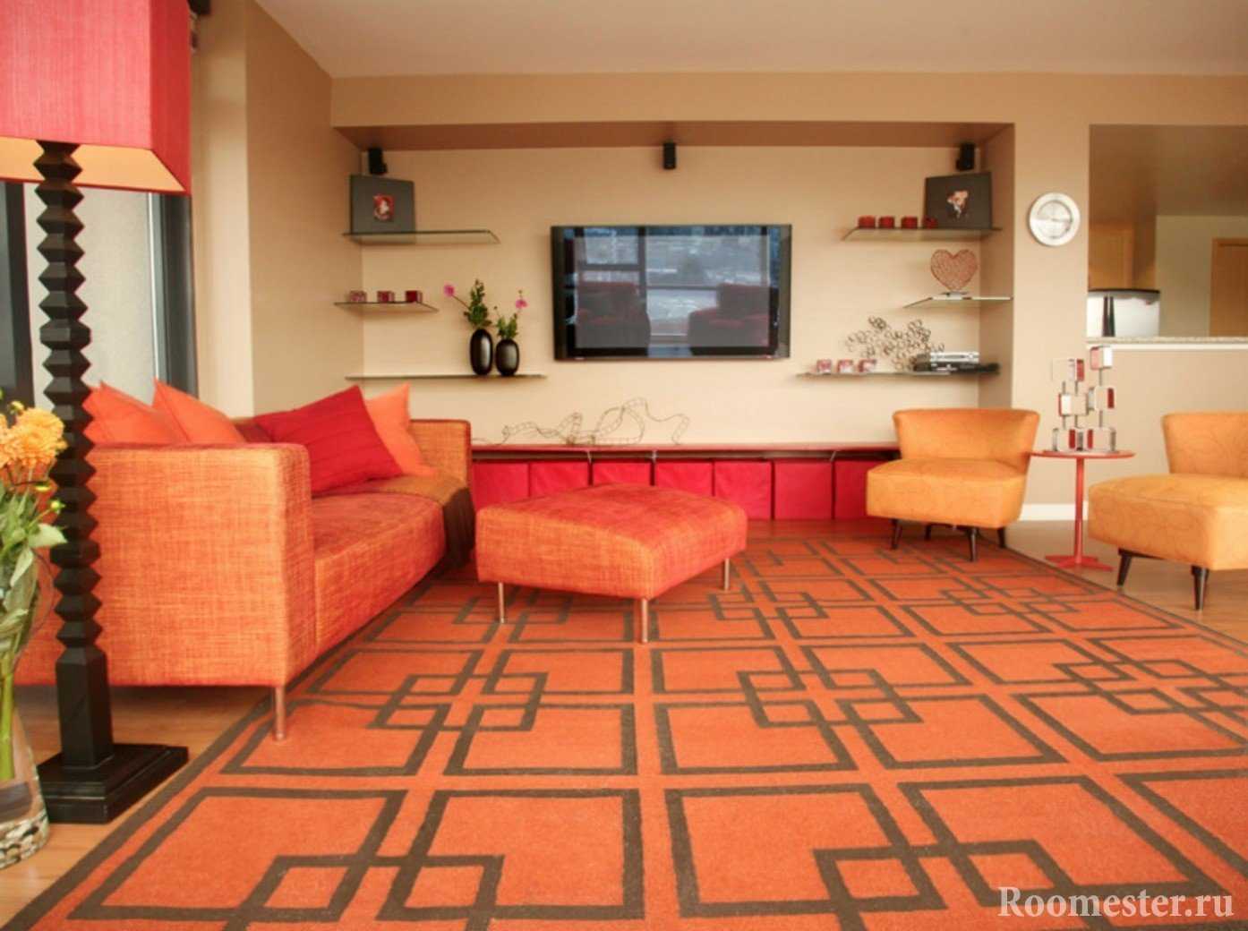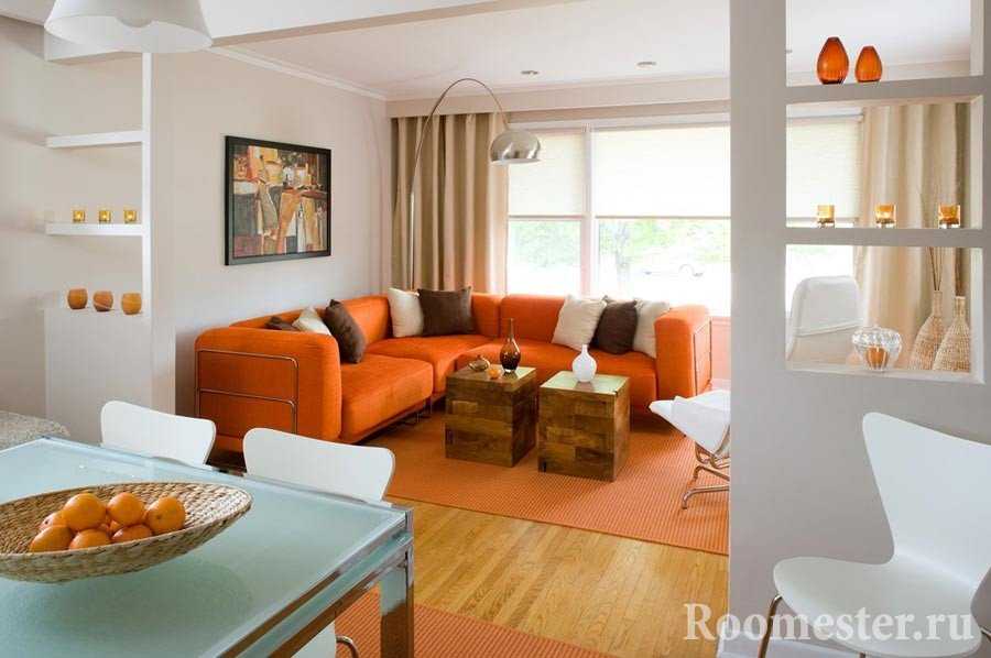 Его применение в гостиной комнате вызвано прежде всего фактором дружелюбия, общительности цвета. Однако при этом следует использовать пастельные оттенки, не напрягающие взгляд. Актуальным применение оранжевого может сделать выход гостиной комнаты на северную сторону.