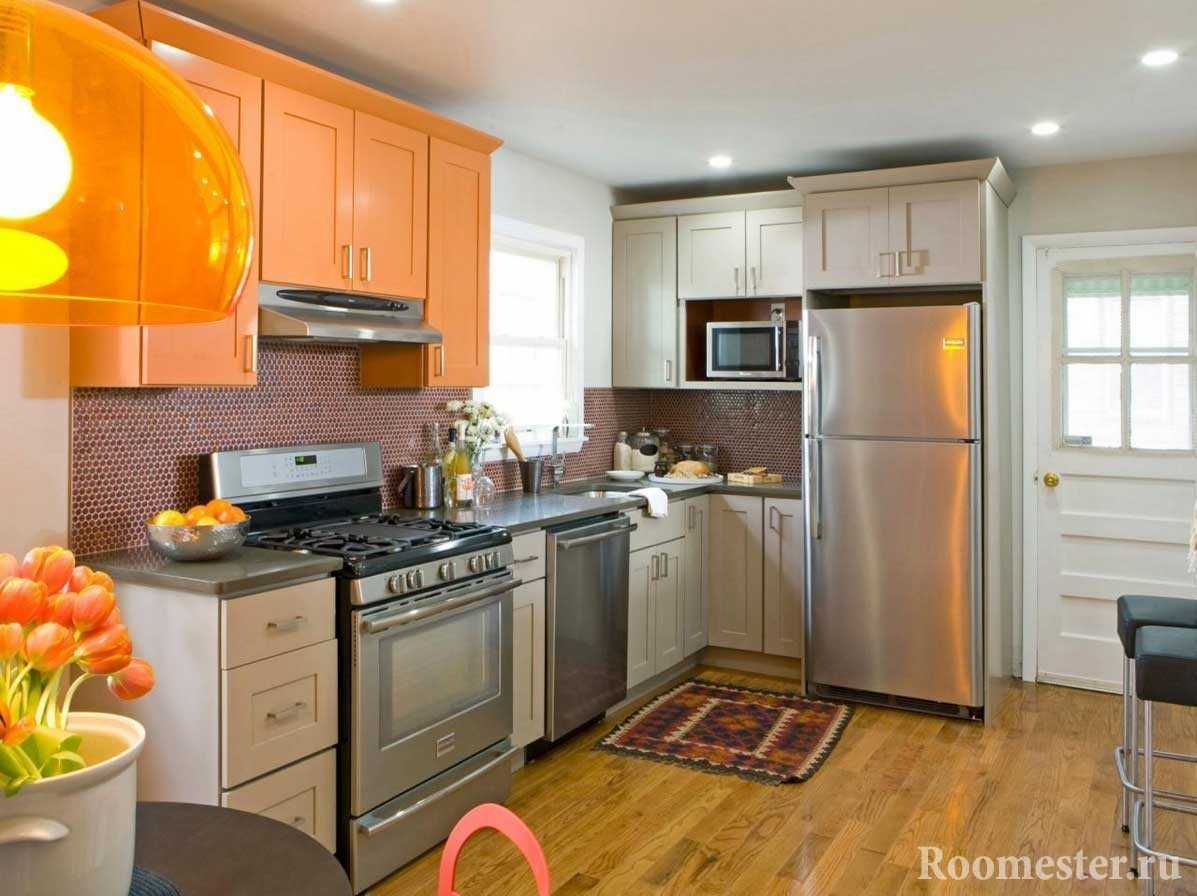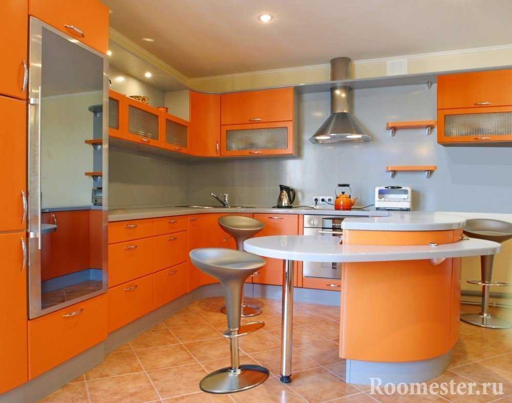 Теплые персиковые тона значительно повысят аппетит. Это могут быть не только обои или плитка на стенах, но и салфетки, кухонные аксессуары, посуда в характерном оранжевом цвете. Если же речь идет о мебели, то ее хорошо сочетать с глянцем фасадов.
