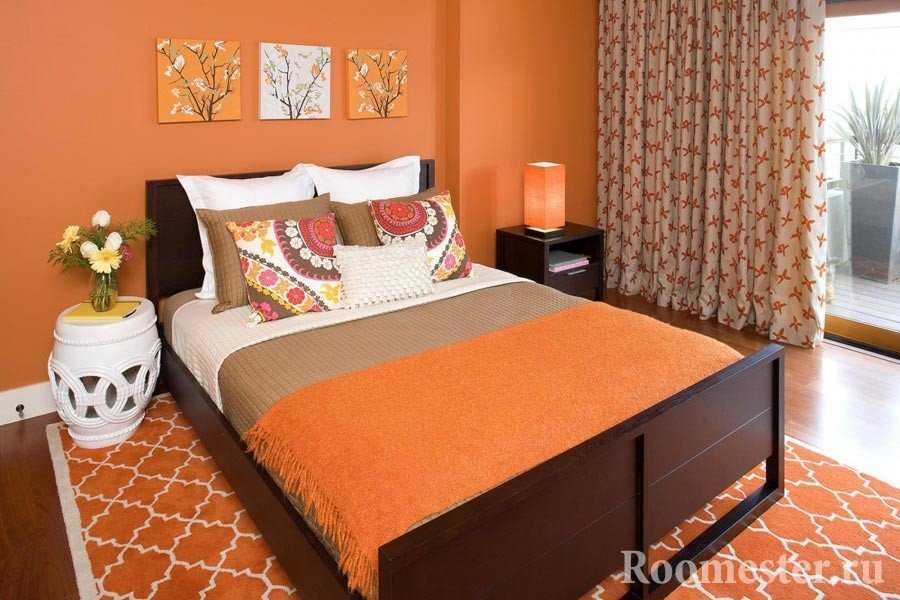 Можно выбрать в качестве оранжевого элемента декора обои либо же остановиться на уютном текстиле.