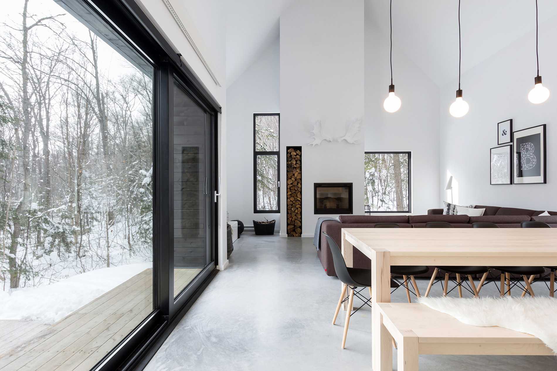 В оформлении помещения можно применить современное интерьерное решение, создать открытое пространство кухни-столовой с большим количеством модульных систем хранения и необходимых для комфортной жизни предметов бытовой техники. Объёмный монументальный камин из бетона не будет выглядеть в минималистском интерьере неуместно, наоборот, он подчеркнёт лаконизм решения, а его строгие прямые линии продолжат геометрию шкафов.