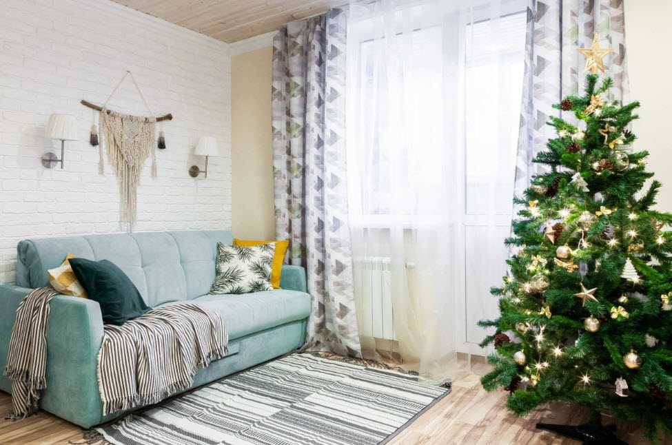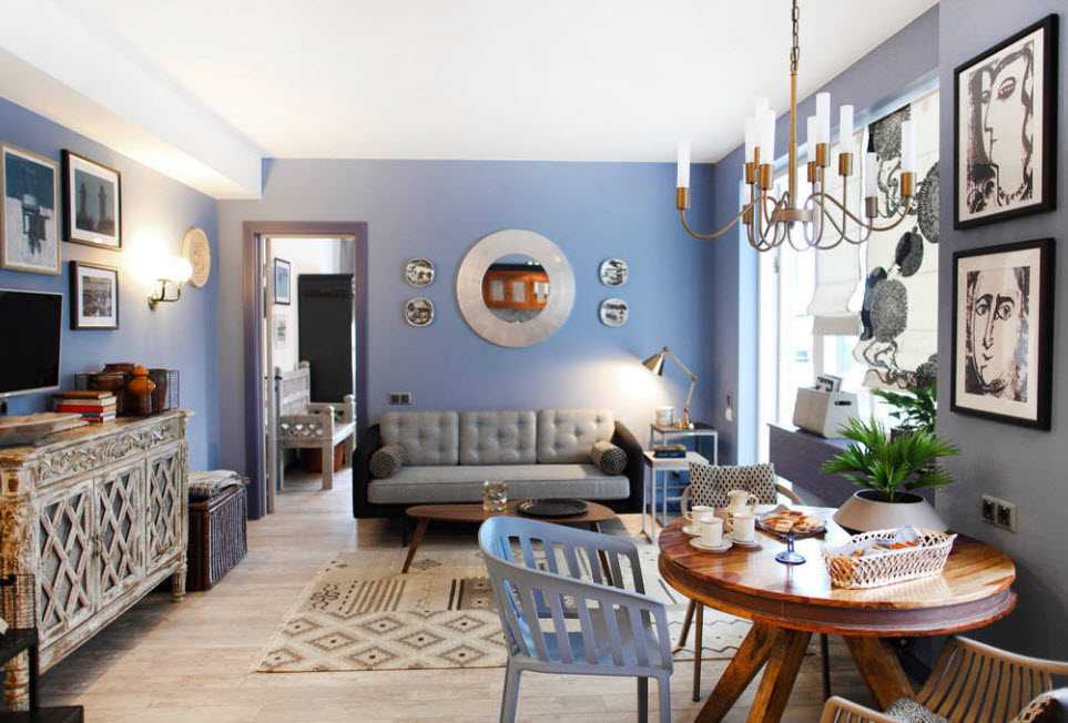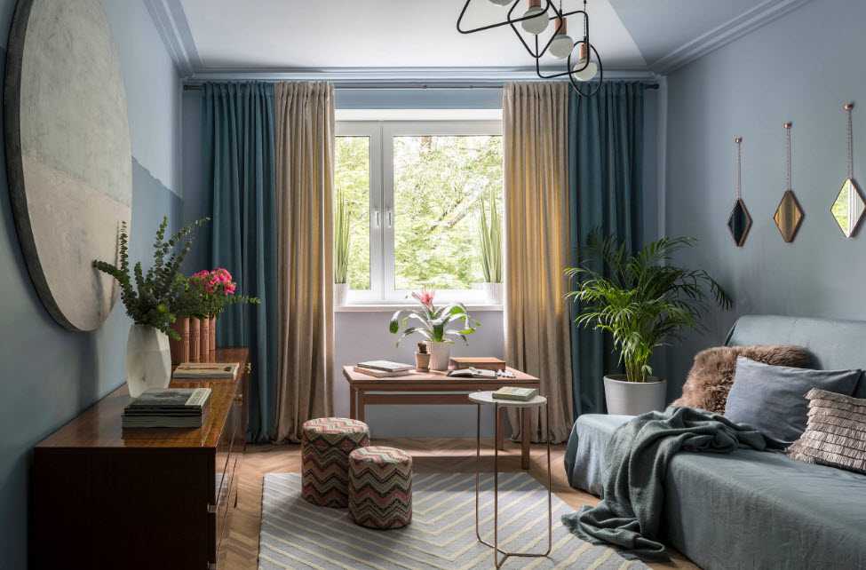 Начните с оформления стен: это могут быть обои или другой материал. Выбирайте светло-голубые оттенки, они помогут расслабиться. Глубокие темные оттенки подойдут для просторных гостиных. Не переусердствуйте, иначе вы превратите светлую комнату в мрачную и неуютную.