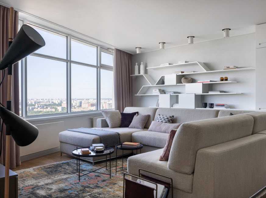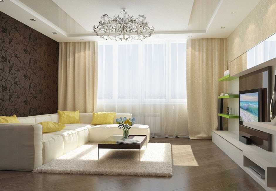 Если в вашей гостиной панорамные окна, центральную стену можно украсить фотографиями, картинами, орнаментом или необычными аксессуарами. Не бойтесь воплощать свои фантазии в жизнь. То, что будет находиться в гостиной, должно приносить положительные эмоции. Для пола используйте светлые оттенки древесины (например, молочный, светлый венге). Рассмотрите такие варианты, как линолеум, паркет, ковролин.