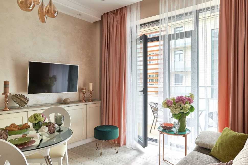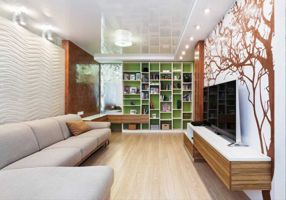 Цвет помогает визуально изменять пространство, например, темный пол, светлые стены и белый потолок сделают комнату больше, а светлая передняя стена и темные боковые добавят пространству глубины. Лучше всего использовать пастельные тона, например, бежевый, серо-голубой, фисташковый и оливковый тона, которые разбавляют теплыми оттенками. Не менее привлекательный вариант – это оформление гостиной в золотистых, песочных, коричнево-кофейных или молочных цветах. В качестве акцентов можно использовать декор оливкового, красного или оранжевого цвета. Наполнить пространство светом позволит качественная система освещения и зеркала.