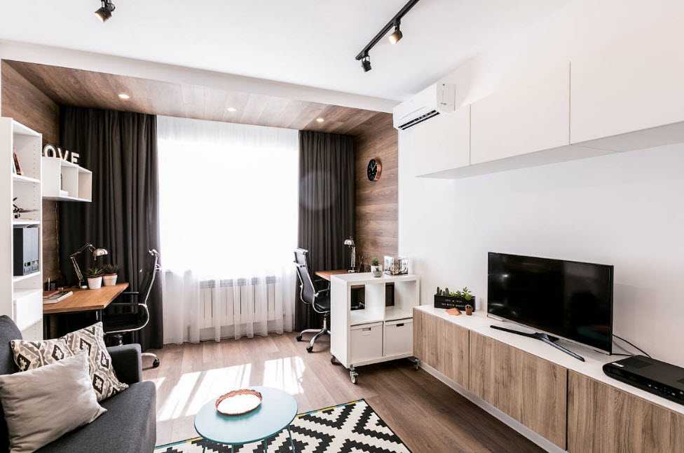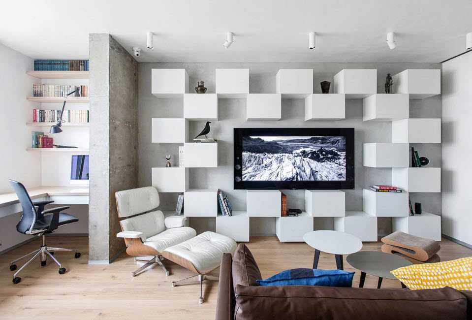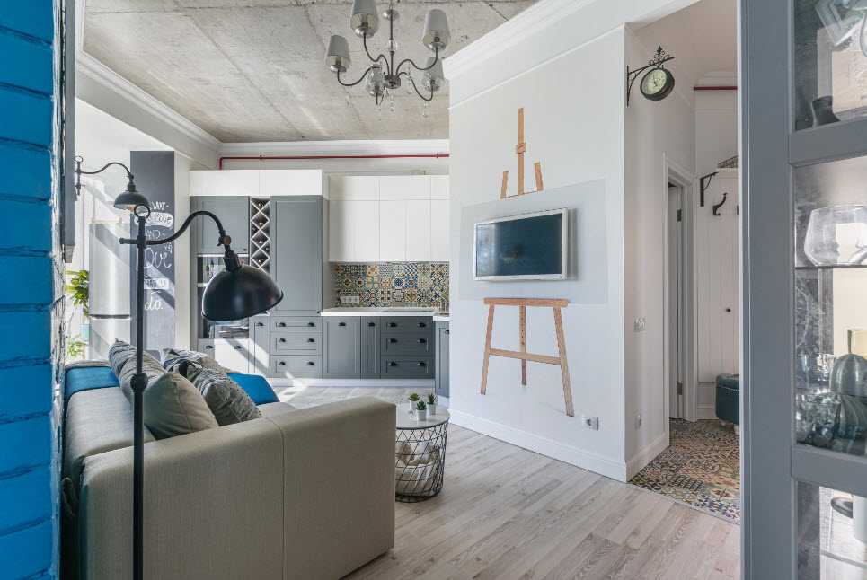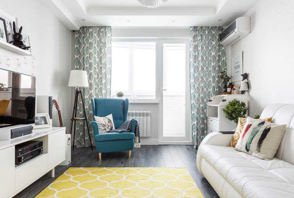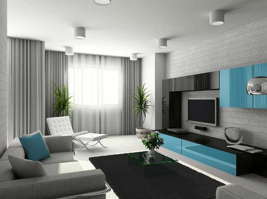 Несмотря на то, что стены синего цвета пользуются популярностью, многие предпочитают комбинировать с белым оттенком. За счет этого получается создать стильный контрастный интерьер, который точно не останется без внимания гостей. Кроме того, в процессе оформления можно использовать различные цветные акценты. Это позволяет немного экспериментировать даже при минимальном бюджете на дизайн гостиной.