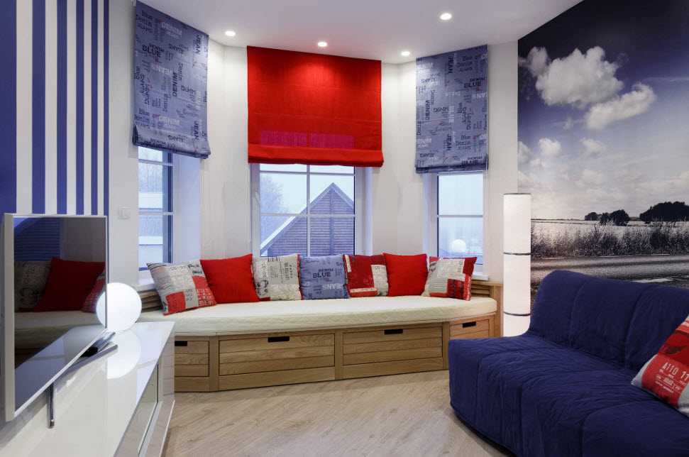 Голубой цвет в первую очередь ассоциируется с морской темой. В комнате с таким оформлением, светлые или насыщенные небесные оттенки сочетают с белым, бежевым и серым. Для данной стилистики характерен полосатый принт, который может присутствовать в отделке стен или мебельной обивке.
