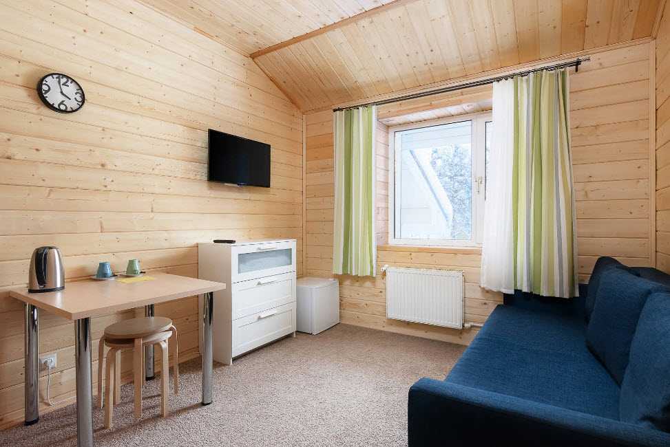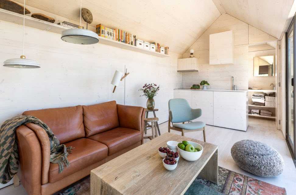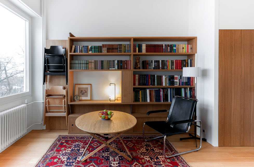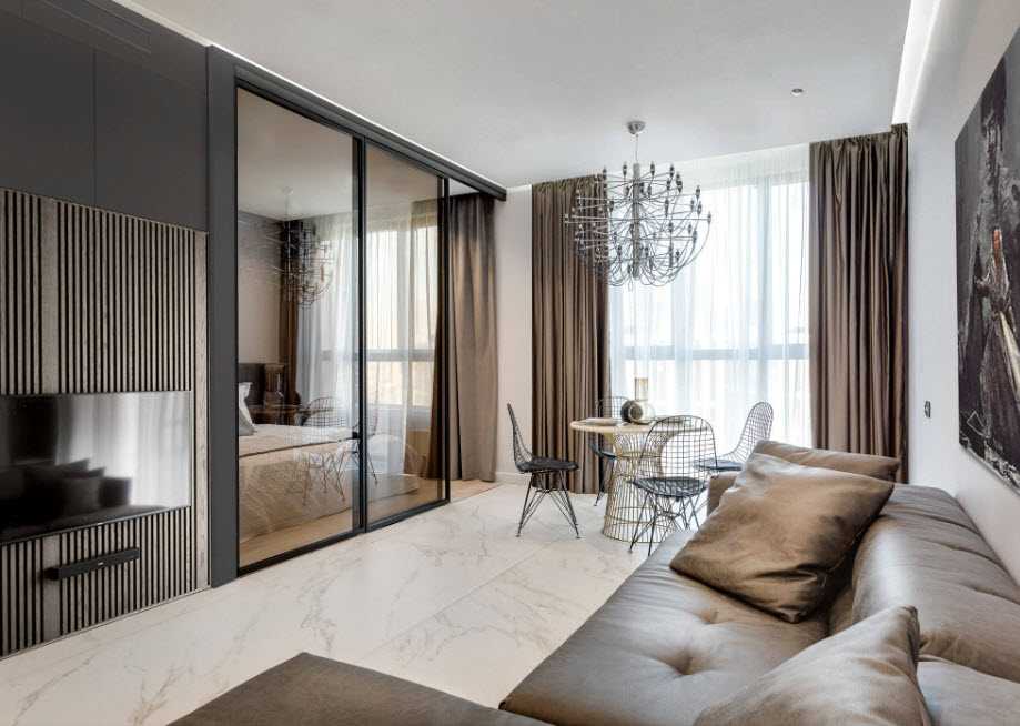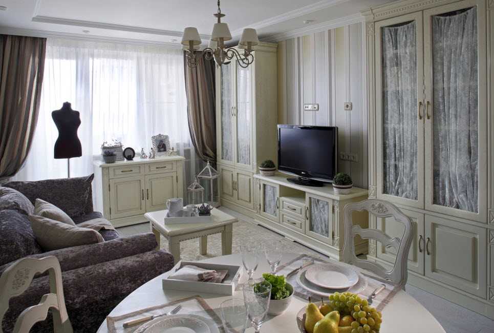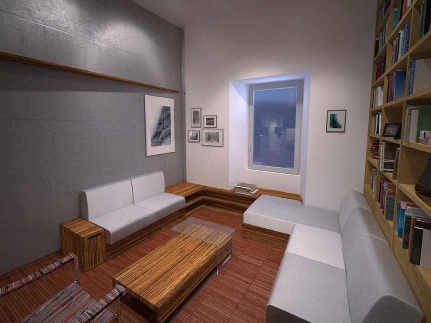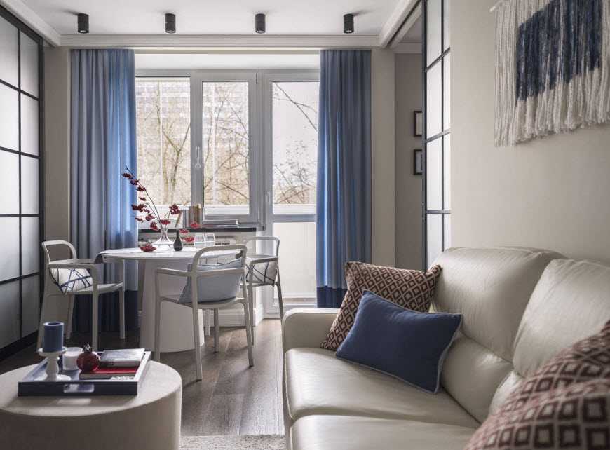 Столики и стулья должны быть раскладными, что позволит изменять внешнее восприятие комнаты, создавая дополнительное свободное пространство. Стол лучше всего расположить в центральной части комнаты, расположив его у дивана. Прекрасным решением станет кожаный диван, имеющий привлекательный внешний вид. Светлая кожаная мебель расширит границы комнаты, сделав ее более просторной. Системы хранения (шкафы) лучше заменить полками открытого типа, используя для этого встроенные или модульные конструкции.