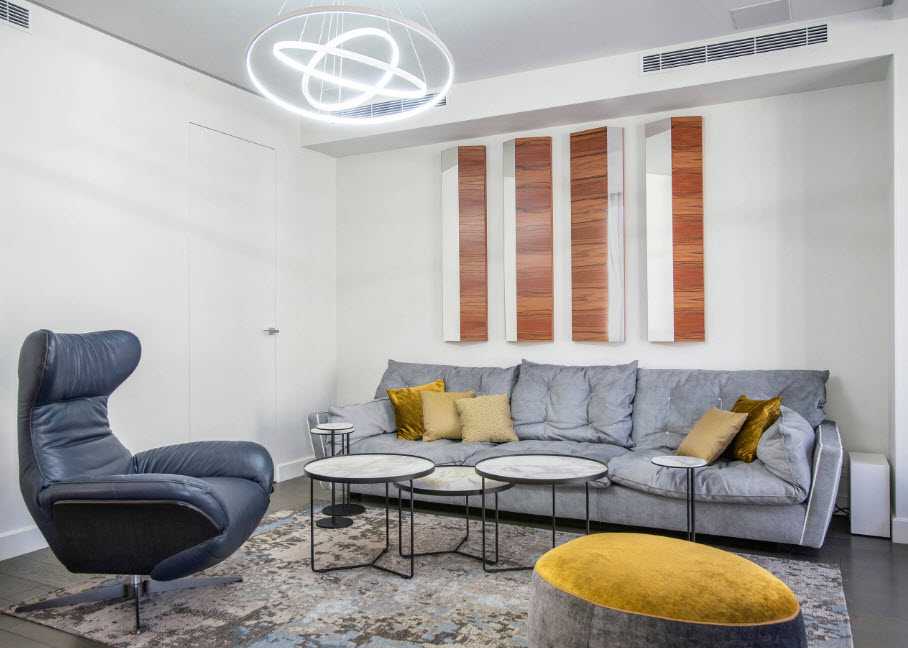 Важно помнить, что голубой цвет – олицетворяет холод, поэтому его нужно грамотно компенсировать и при этом не нарушить цветовую композицию гостиной. Как это эффективно сделать? Прежде всего, с помощью грамотно организованной подсветки и основного искусственного освещения