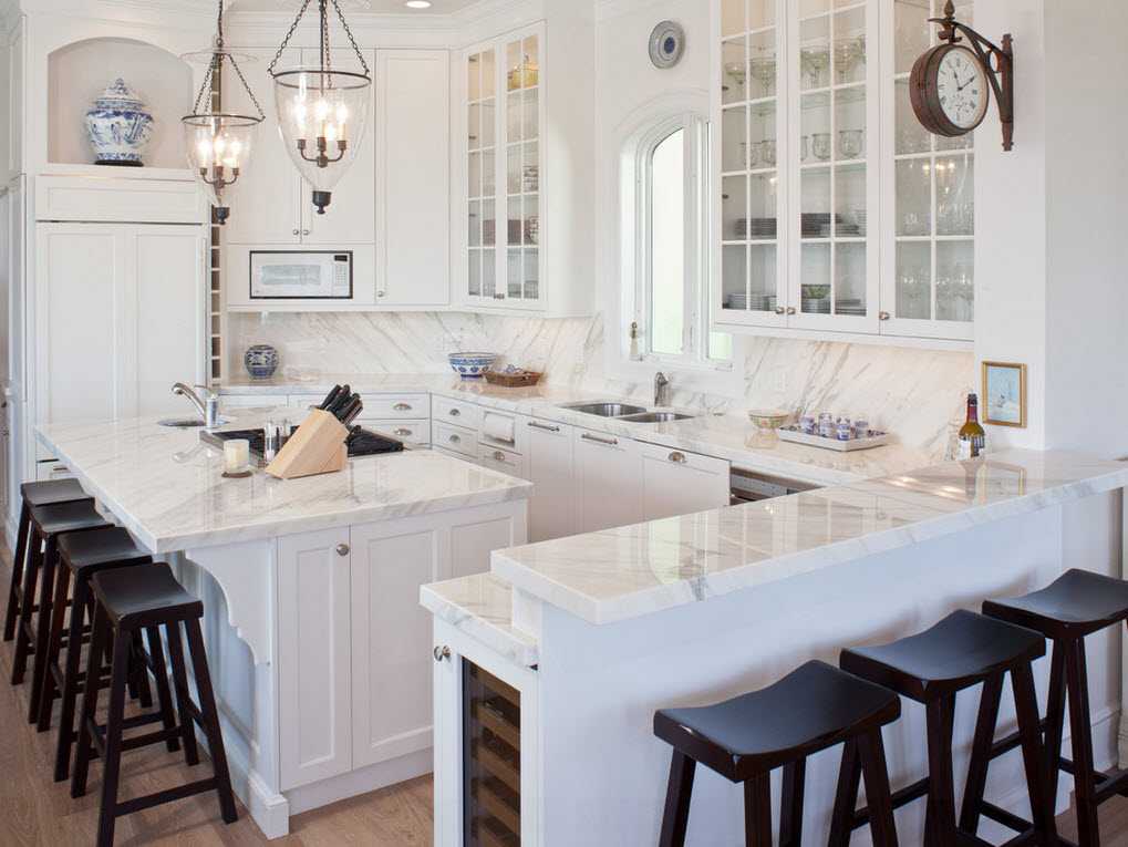 При оформлении большого помещения необходимо соблюдать правила треугольника. Большая кухня позволяет оформить отдельно рабочую и обеденную зону, сделать это можно при помощи зонирования в виде двухуровневого потолка или локальной подсветки.