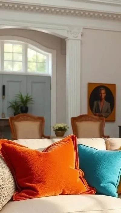 В вопросе материалов тренд — смешение фактур. Шерсть ценится за натуральность и тепло, а микрофибра проще в уходе. Оптимально сочетать оба варианта, создавая тактильное богатство. Льняные подушки дополнят интерьер, бархатные валики добавят роскоши. Для смелых акцентов используйте диванную подушку из коровьей шкуры нейтрального бежевого или карамельного цвета. Важно: нет необходимости строго сочетать материал подушек с обивкой или другим текстилем, наоборот, это создает живой и многослойный эффект. Гладкий материал гармонично смотрится с текстурными портьерами или римскими шторами, и наоборот, обеспечивая сбалансированный ансамбль.