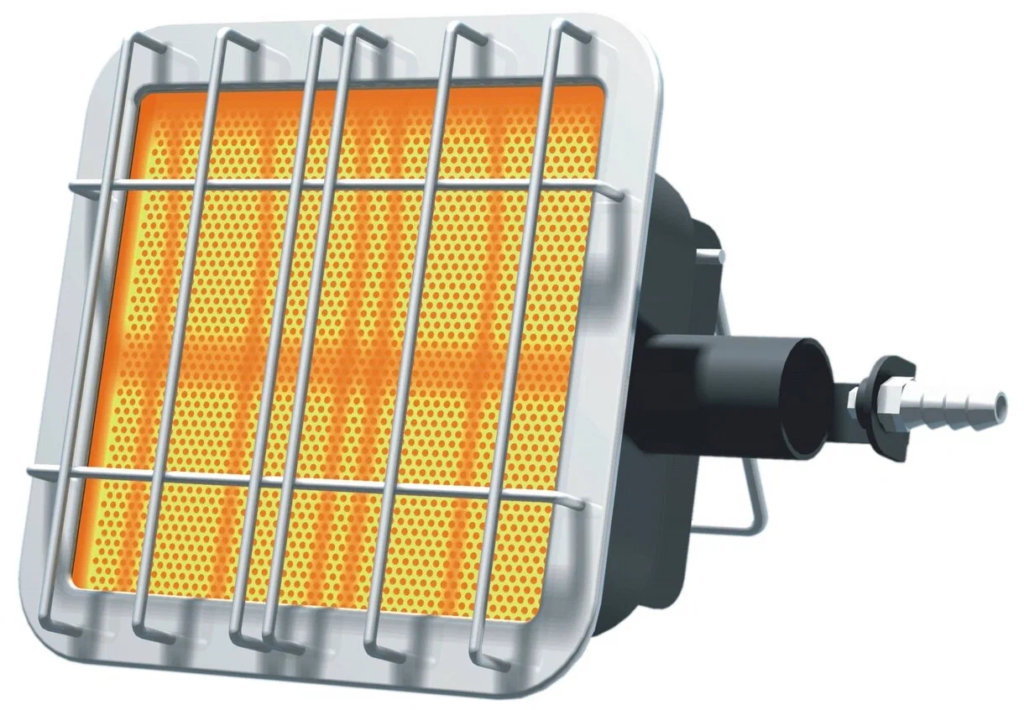 Инфракрасные. Универсальные обогреватели, которые могут эффективно применяться как внутри, так снаружи помещений. Специализированные инфракрасные нагреватели часто устанавливают на террасах, в беседках, на верандах. Внутри такого оборудования устанавливаются металлические и керамические нагревательные элементы, которые отражают тепло от горелки. Для работы инфракрасных обогревателей применяется сжиженный и природный газ.