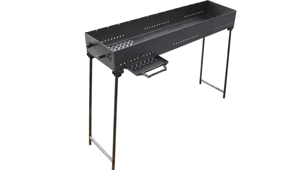 Сборное приспособление на высоких подножках имеет достаточно длинную жаровню, которая состоит из двух частей. Одна из них выполняет функцию горения дров с последующем образованием в угли. В оборудование встроен перфорированный колосник и выдвигающийся зольник. На всем остальном пространстве размещаются раскаленные угли для приготовления пищи. Благодаря такой конструкции, происходит непрерывный процесс запекания желаемых продуктов, при необходимости можно добавлять в рабочую зону нужное количество топлива.