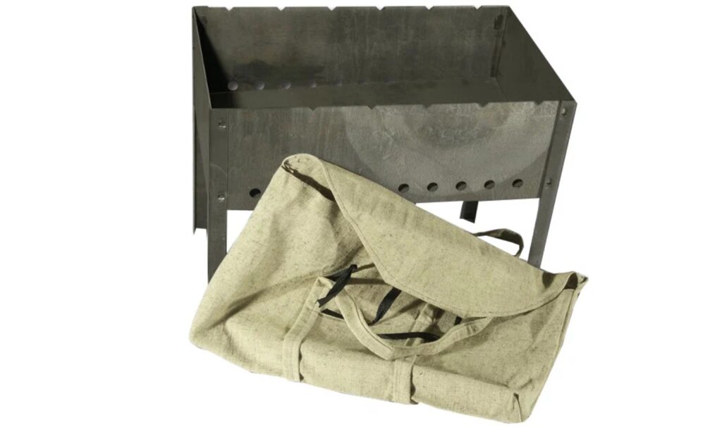 Одна из самых простейших конструкций. В комплект входит брезентовая сумка. В боковых частях имеются отверстия для воздуха и ложбинки для шампуров. Ножки изготовлены из уголка довольно прочные.