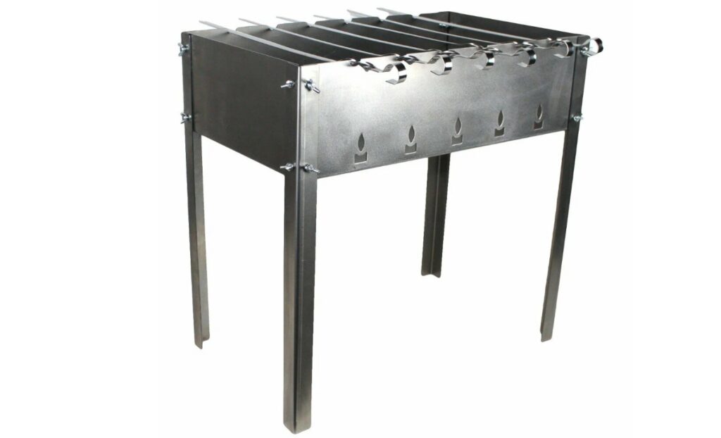 Вся конструкция фиксируется крючками методом сцепления. Для данной модели шампура приобретаются дополнительно. Ценовая сторона оправдывает покупку. В частых случаях такую модель используют в походах. Средний срок службы — несколько лет.