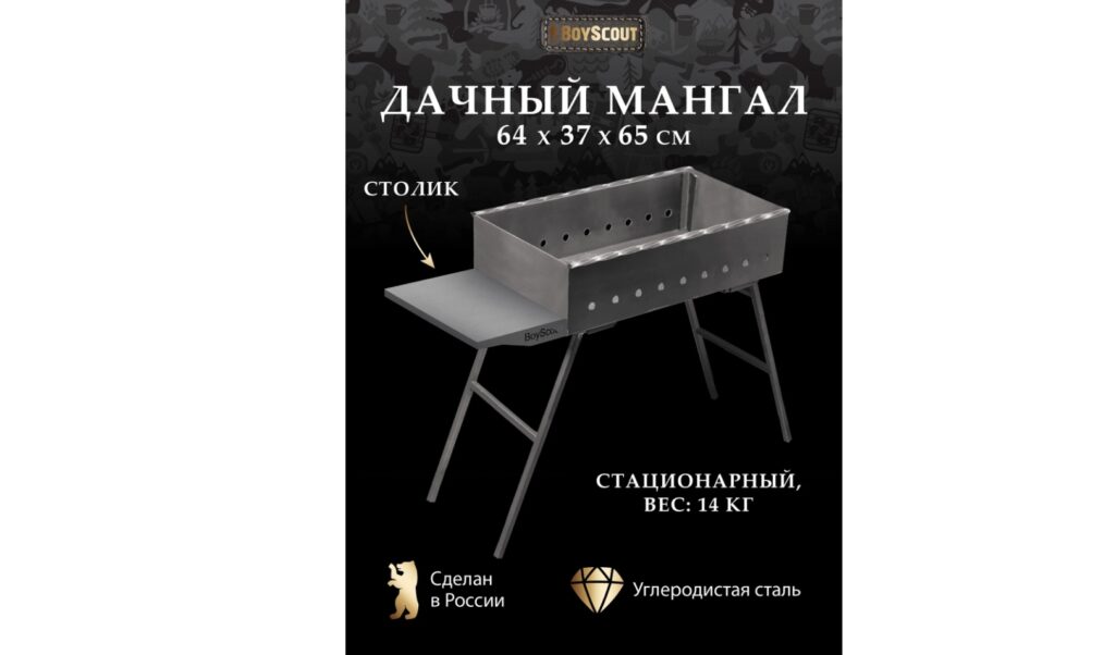 По соотношению цены и качества это, пожалуй, лучший комбинированный мангал для дачи в 2020 году. Его высота как раз такая, чтобы можно было колдовать над жаровней стоя. У одного из торцов приделана небольшая деревянная полочка, а по длинной стороне — деревянный же столик. Правда, как говорят пользователи, дерево, хотя и эффектно выглядит, от жара и золы быстро теряет всю свою красоту. Лак темнеет, сереет, и либо приходится его регулярно очищать, ошкуривать и заново окрашивать, либо выбрать вариант с полками из металлической сетки.
