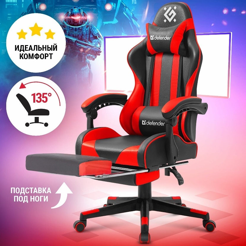 Defender Rock – кресло ориентированное на использование геймерами, которые желают создать максимально комфортное место с отличной эргономикой и удобной посадкой для снижения нагрузки на спину и исключения появления проблем со здоровьем при длительном сидении. Оформлено в современном стиле, имеет продуманную конструкцию, отделка из высококачественной искусственной кожи сделана в ярких красках. Благодаря использованию пенополиуретанового наполнителя форма сидения и спинки сохраняется в течение всего срока эксплуатации. Предусмотрены подушки для спины и головы. Для обеспечения повышенного удобства при посадке используются специальные боковые опоры на сидении и спинке. Также имеется выдвижная подставка под ноги, которая позволит снизить с них нагрузку, обеспечить оптимальный кровоток и исключить их онемевание.