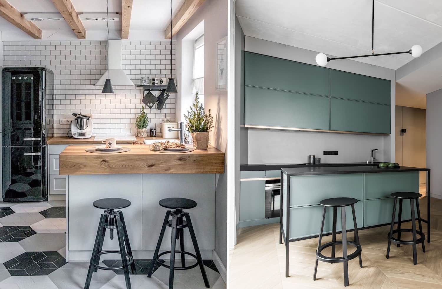 Одна часть гарнитура может быть белой, а другая – деревянной, цветной, черной или любой другой. Решение простое, не банальное и может принести много пользы. Например, одну часть шкафов можно оформить в тон стен, чтобы получился эффект невидимости, и пространство казалось менее загроможденным.