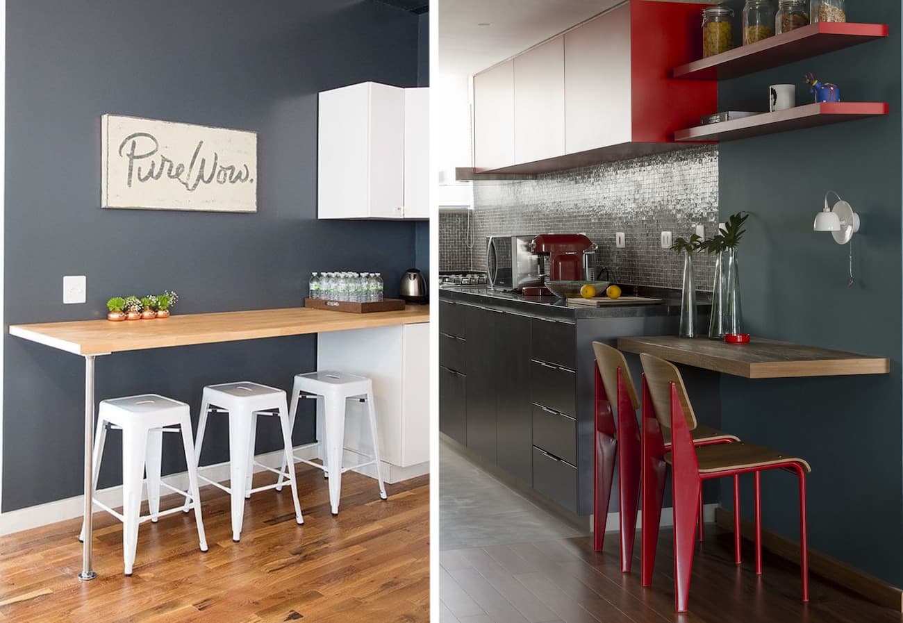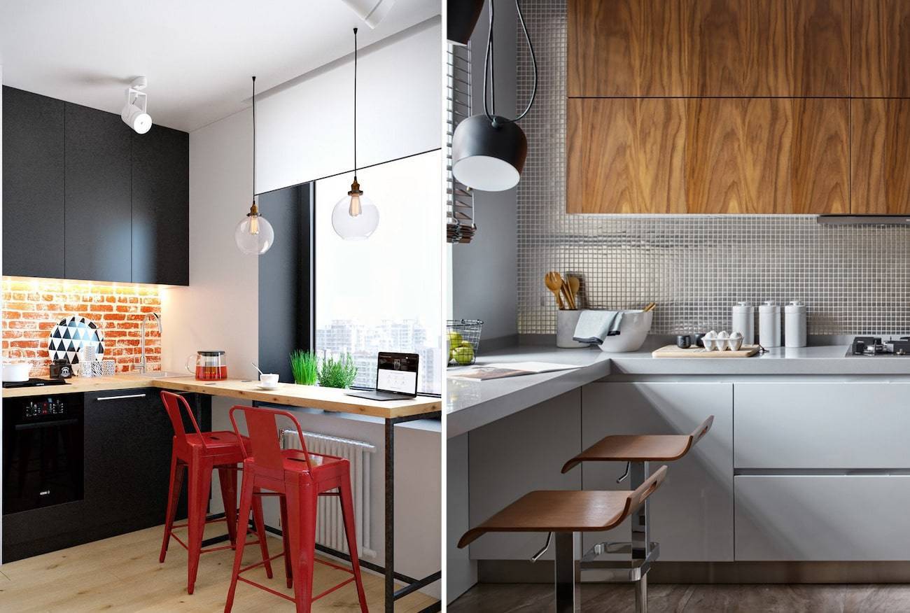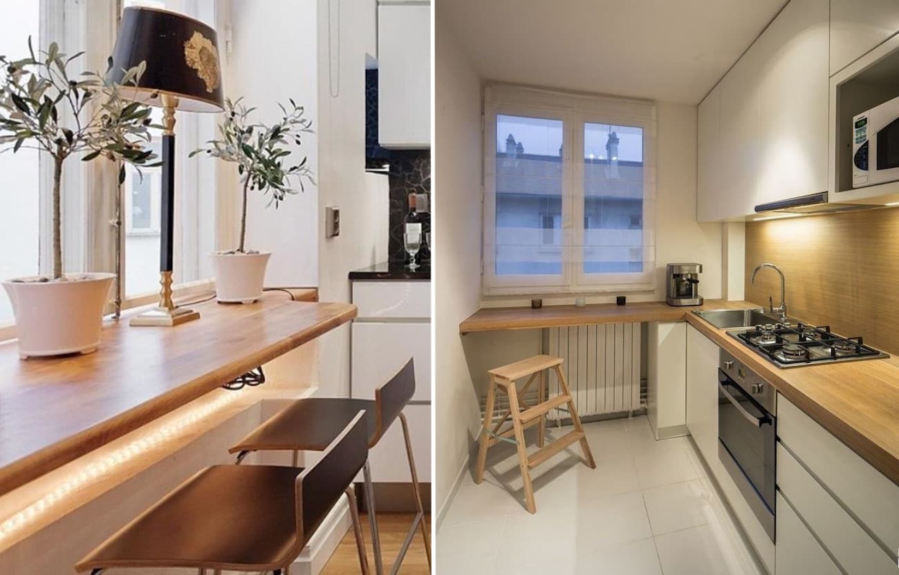 Для сохранения полезной площади устанавливают барную стойку или раскладным обеденным столом. Также можно в качестве обеденного стола или рабочей поверхности использовать переоборудованный подоконник.