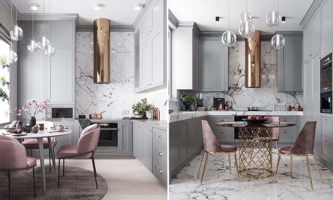 Изящная серая кухня с вытяжкой золотого цвета