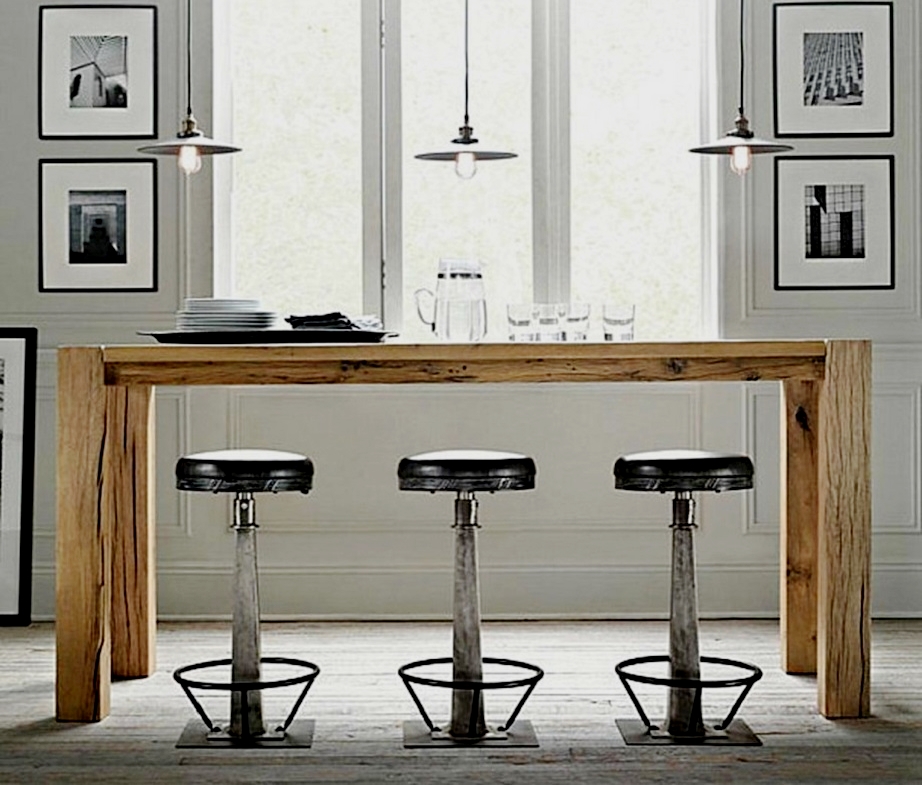 Консольными столами сегодня принято называть любые образцы обеденной мебели, которые имеют небольшую глубину, из-за чего кажутся (а порой и являются) не слишком устойчивыми. Зато владельцам тесных кухонь такие изделия подходят просто идеально: в длину для столешниц ограничений никаких нет, так что даже при большой площади поверхности они не занимают много места. Консольные столы впервые появились при французском королевском дворе, так что изысканность линий и богатый декор для них – норма. Но сегодня выпускаются барные модели более простых форм, как на фото ниже. Так что в современном динамичном интерьере и для них найдется место.