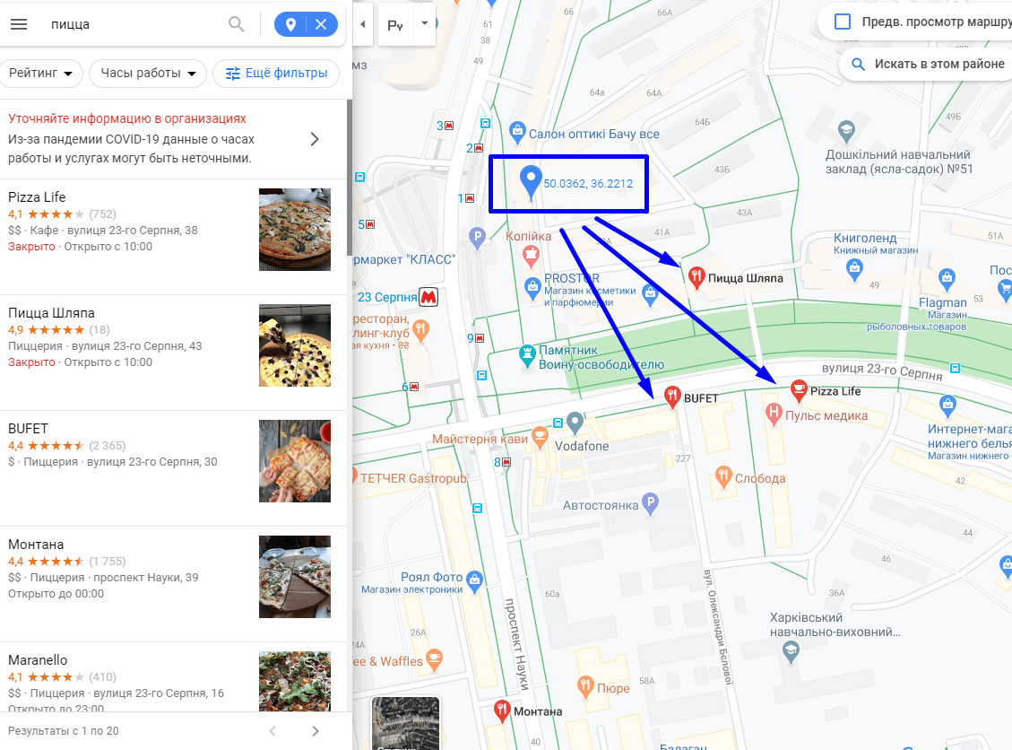 На скрине ниже человек ищет пиццу рядом с домом. Результаты, которые ему показываются, – все буквально в нескольких минутах ходьбы от дома, так что близость здесь точно не играет роли: