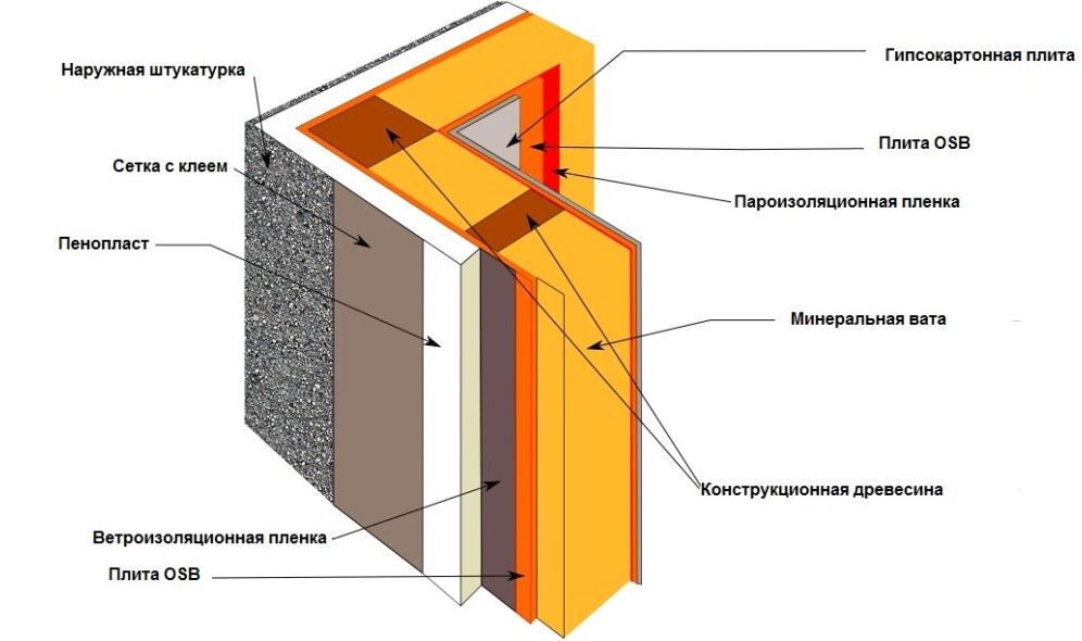 В быстро возводимых постройках по скандинавской или американской технологии, роль теплоизолятора отведена непосредственно стеновым панелям. Утеплитель монтируется между стойками каркаса и закрывается черновой обшивкой – древесно-волокнистыми панелями, плитами ОСБ и т.д.