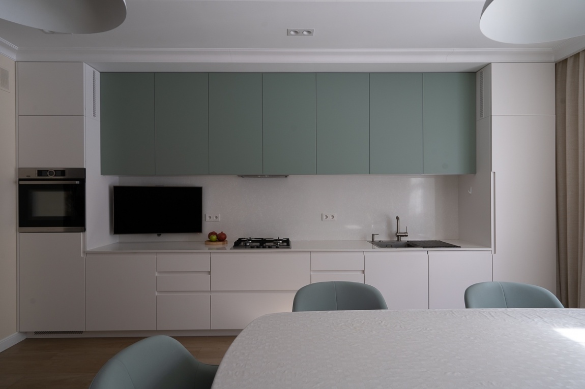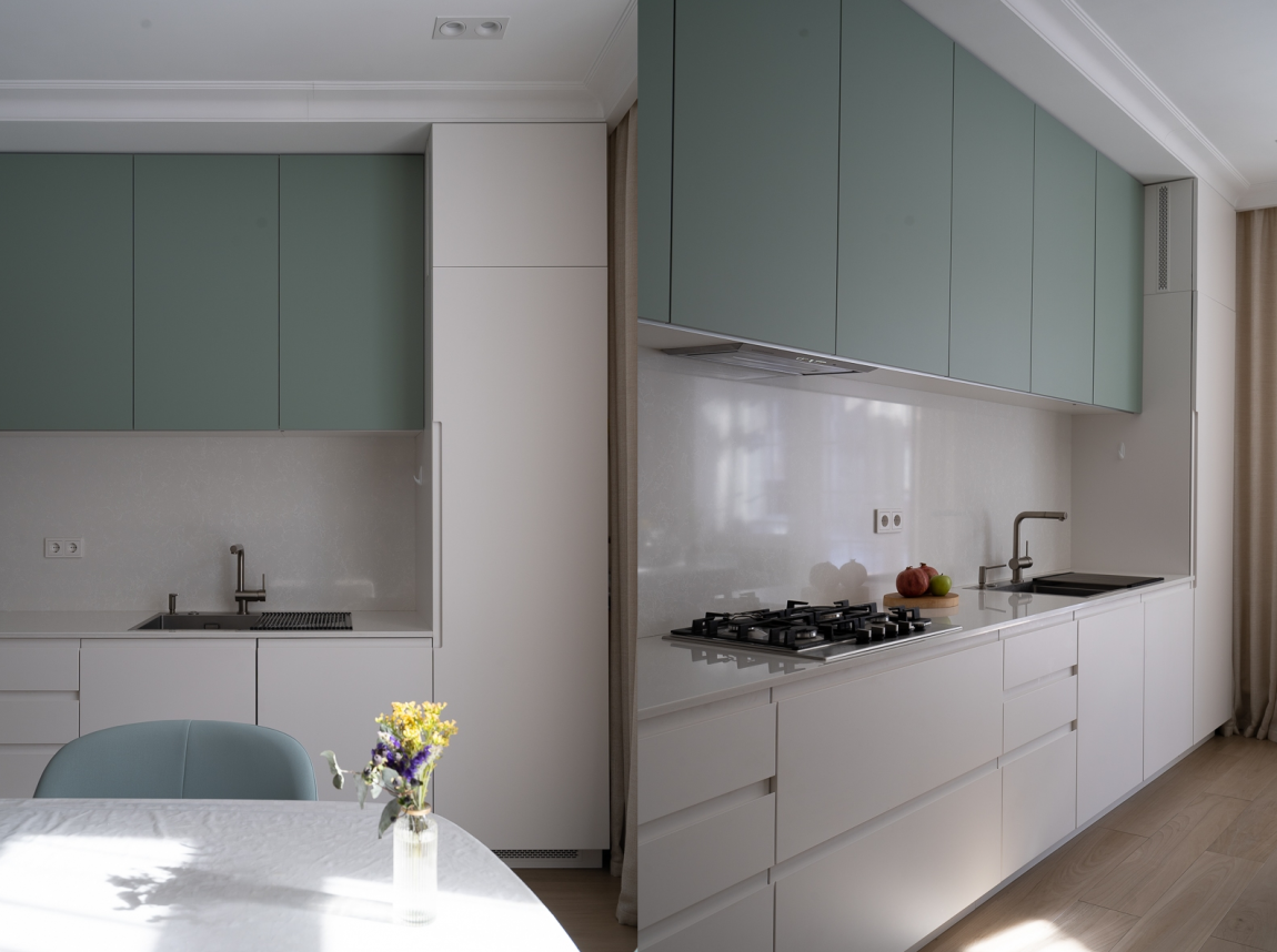 Рабочая поверхность должна проходить по всему периметру кухни, а не ограничиваться островками за мойкой и плитой. Хотя за мойку и плиту вода и грязь попадают чаще, другие места всё равно не в безопасности. Экономить нужно не на этом.