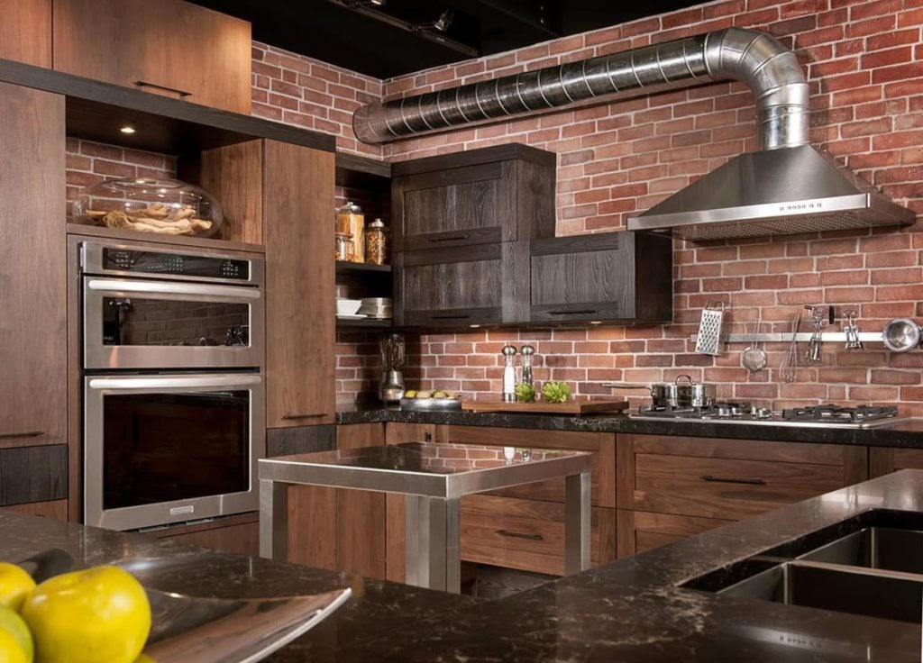Лофт – коммуникации открыты, кирпич остаётся «голым» без отделки, мебель брутальная, нарочито грубая. Такая кухня подойдёт свободолюбивым, ярким людям.