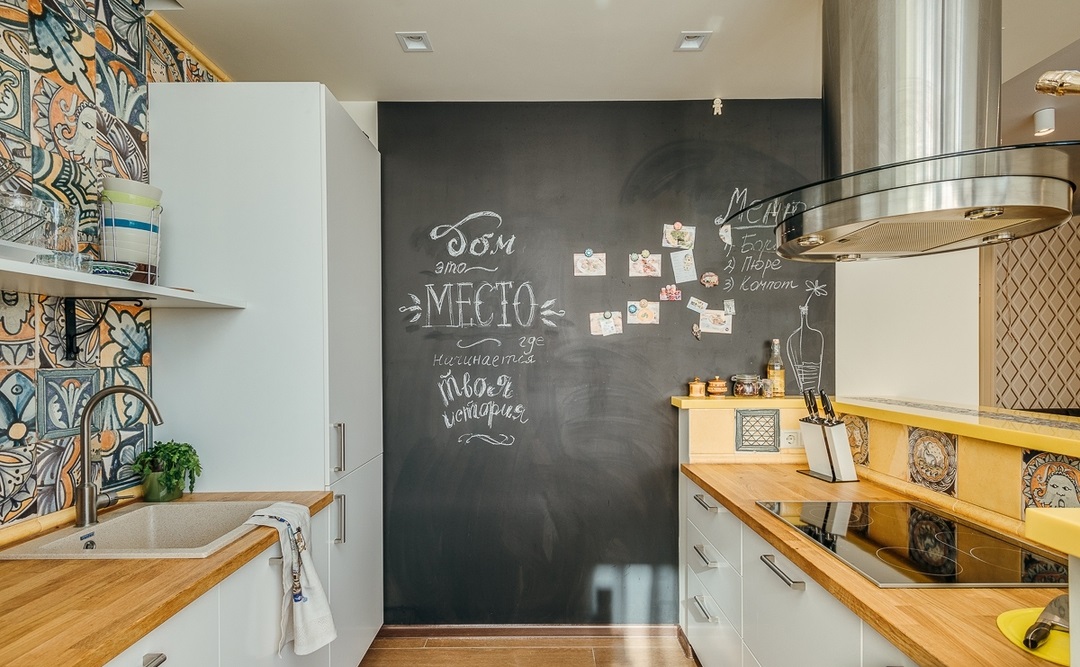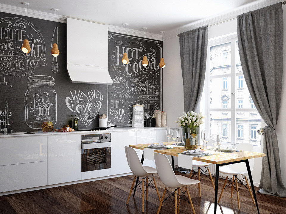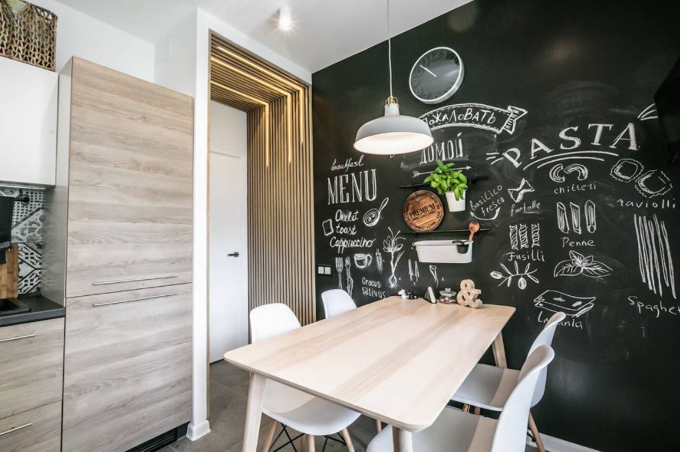 Грифельные доски с нарисованным мелом меню уже прочно вошли в интерьеры многих кафе. А ведь такая идея легко повторима на собственной кухне. Можно повесить на стену меловую доску, покрыть стену грифельной краской или оклеить ее специальными обоями.
