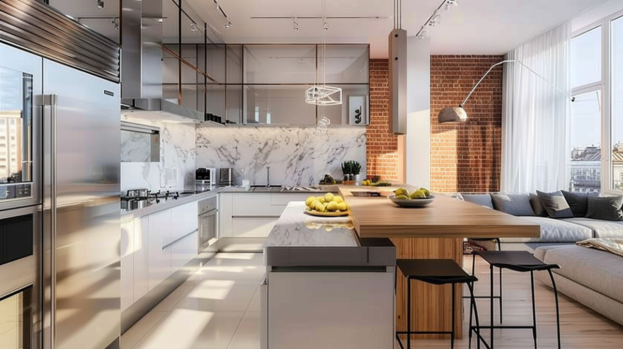 Современные тенденции предлагают интеграцию рабочей зоны кухни в объединенное пространство студии или кухни-гостиной. Для визуального разделения этих зон часто применяются элегантные перегородки из стекла и металла, решетчатые конструкции, декоративные занавеси или стеклоблоки. При этом сохраняется общая воздушность и прозрачность пространства. В некоторых проектах предпочтительнее разделить кухню с гостиной за счет установки кухонного острова.