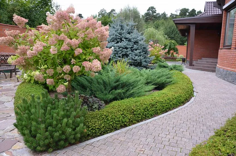 Еще один популярный прием составления ландшафтного модуля – сочетание елок и кустарников. Такой тандем требует правильной расстановки акцентов: высокие растения уходят на второй план, на переднем высаживаются низкорослые кусты.